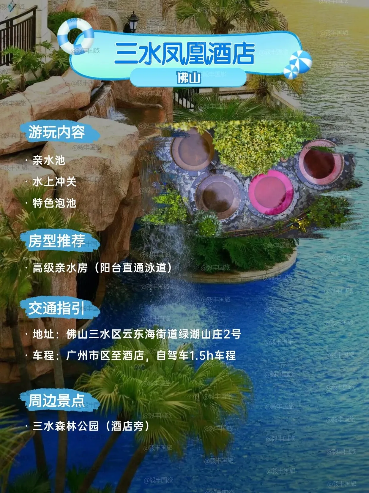 佛山三水凤凰酒店的泳道环绕酒店,同样适合夏季玩水。