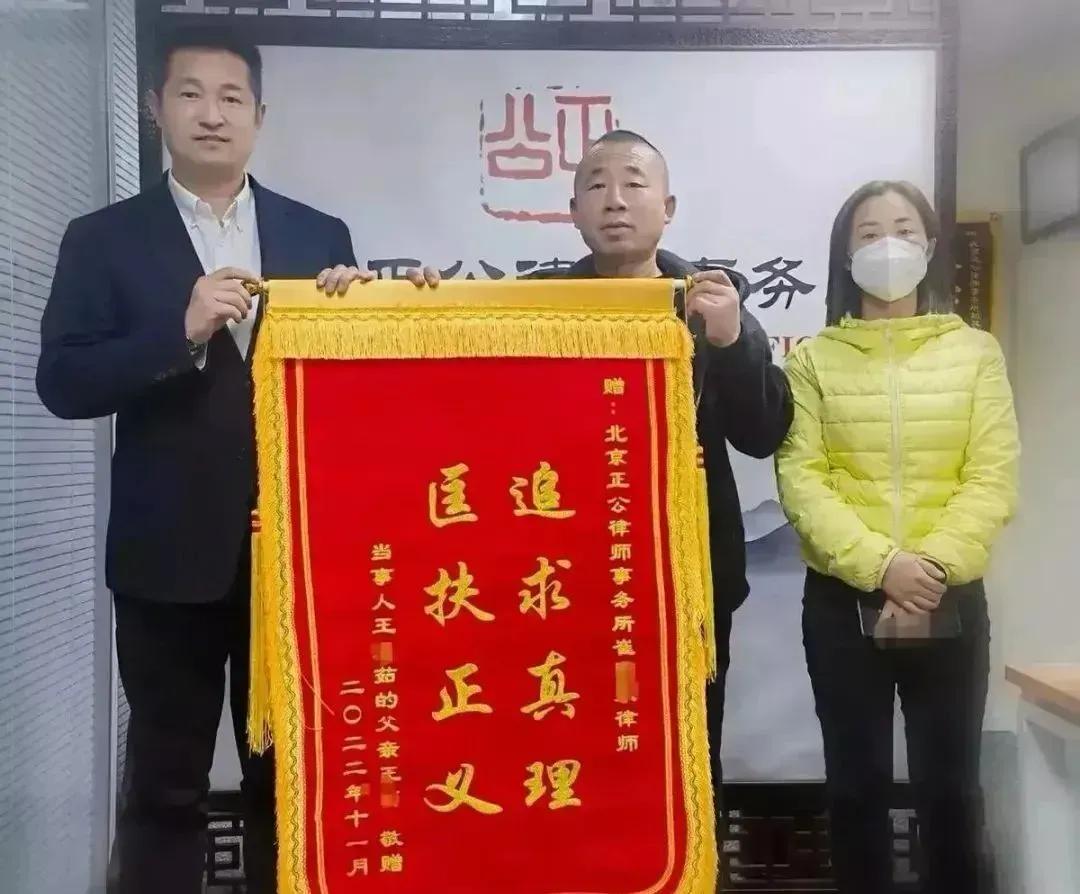 除了言语上的感谢,王亚茹和父亲还给崔律师送上一面锦旗,上面写着“追求真理,匡扶正义”。