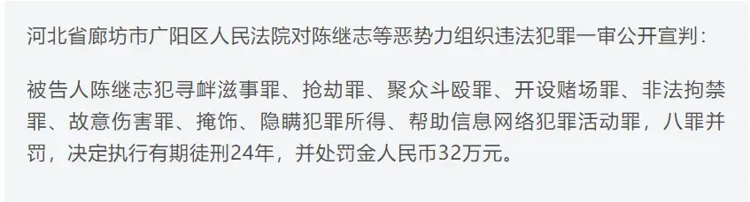 陈继志在法院一审中,被判刑24年,并处罚金32万元。