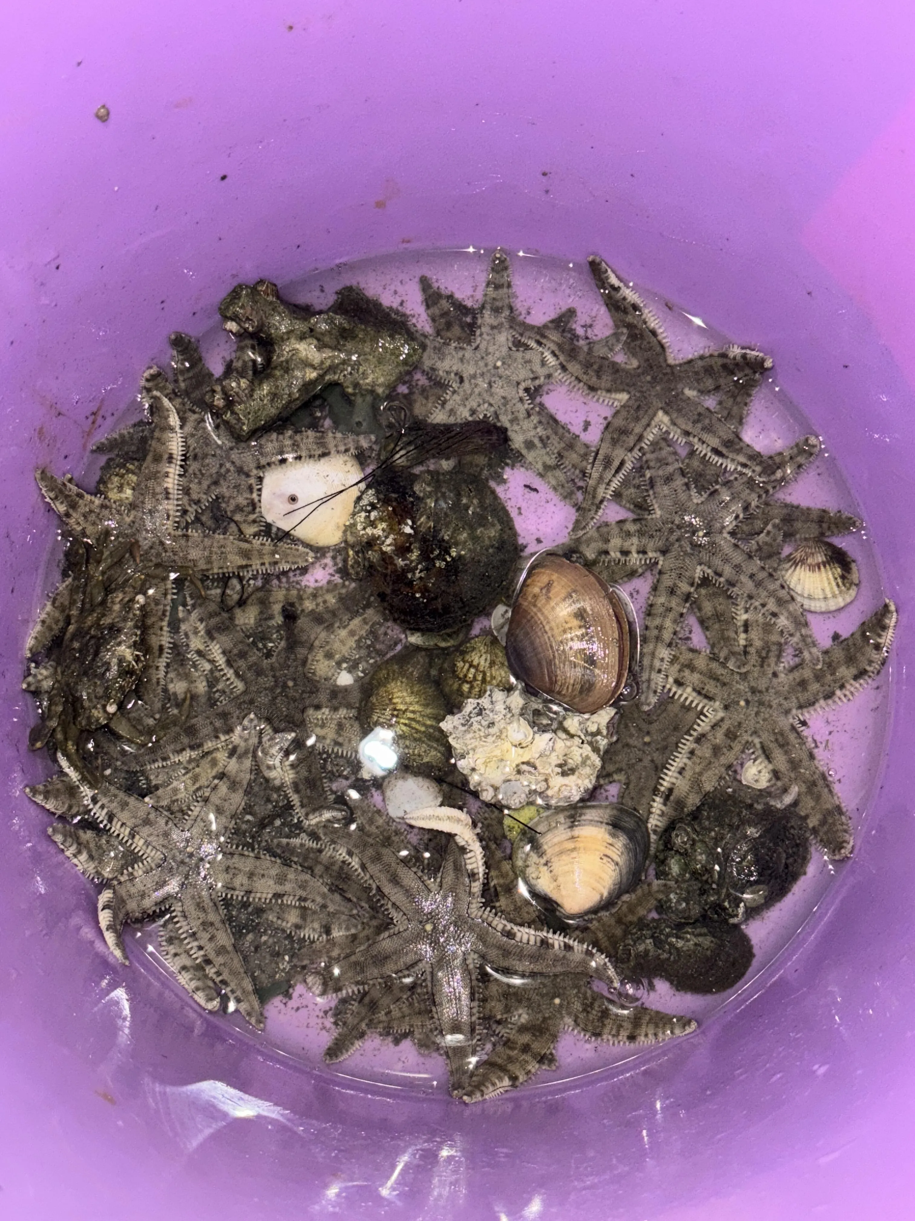 在码头坐公交船去赶海(8元),到了往左走有一大片滩涂。建议六点后退潮时来,可以捡到很多螃蟹、贝壳和海星,完全不需要跟团。