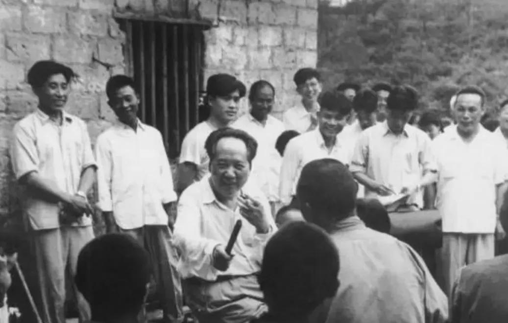 那位文人手握拐杖,频频挥舞,看到毛主席与工作人员后,便上前打招呼,但他的拐杖仍然不停地旋转。