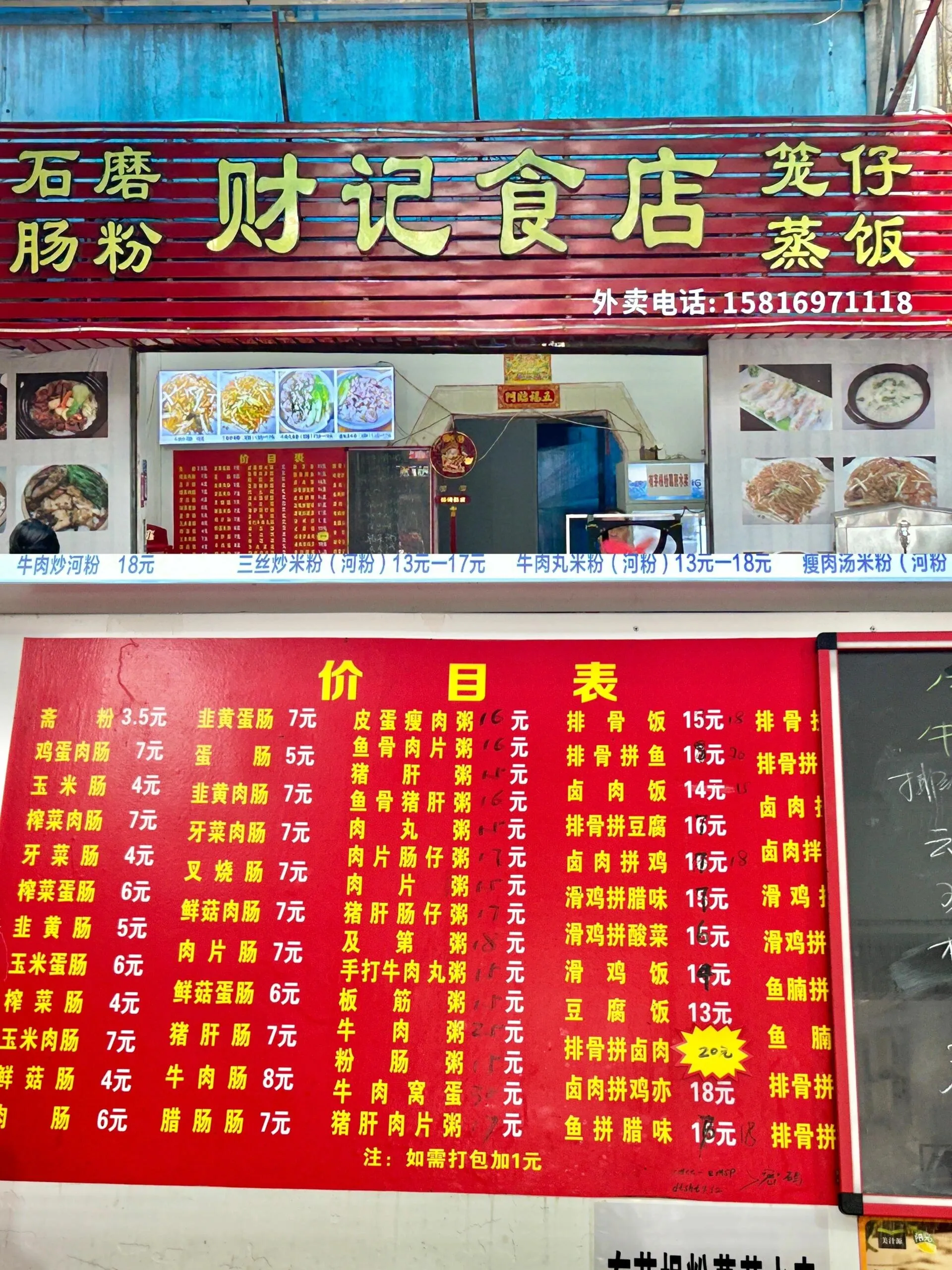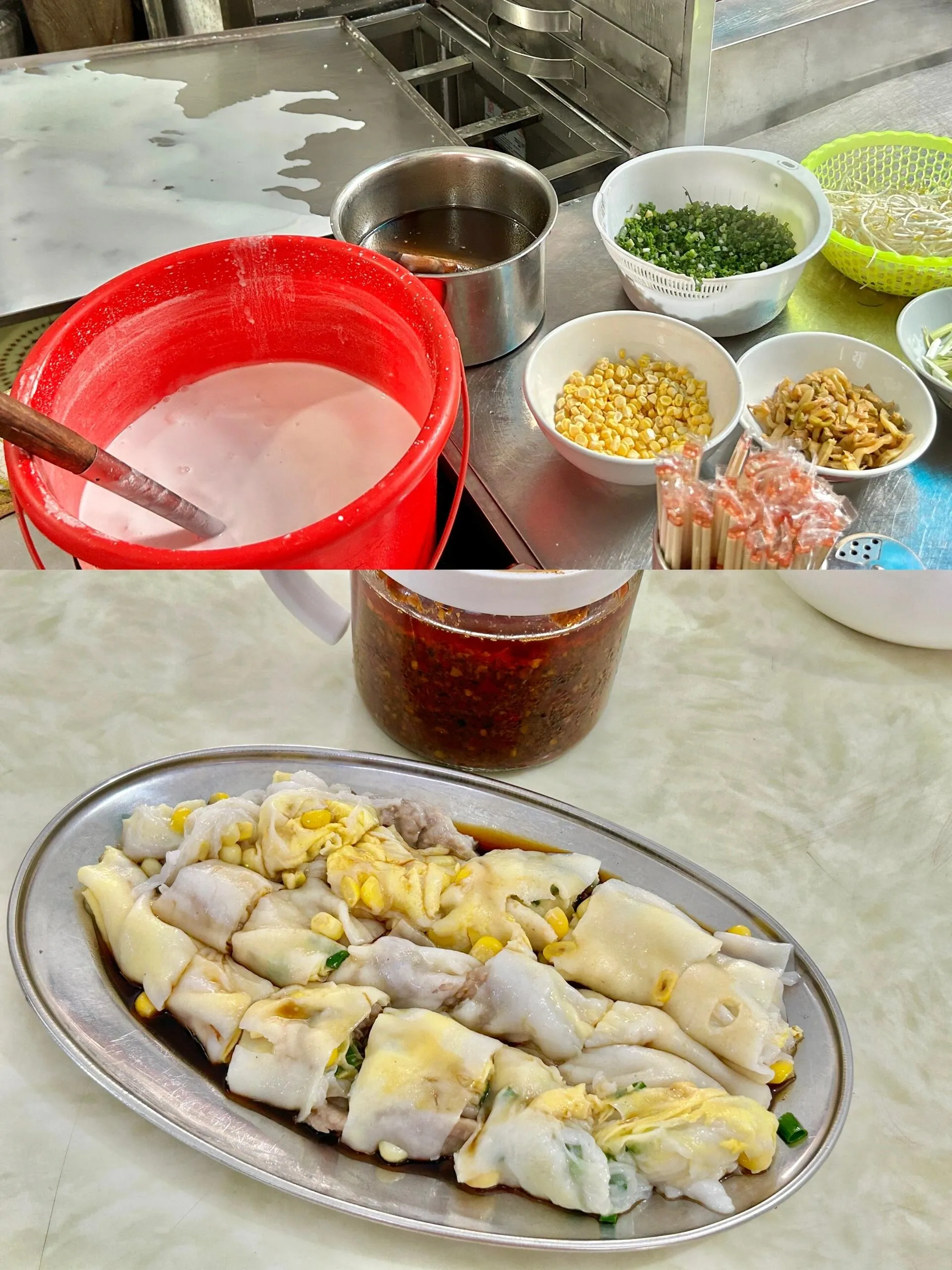 财记食店的牛肉玉米蛋肠粉是性价比之王。 一份肠粉里有大量大块牛肉,额外加鸡蛋和玉米粒只需8元。肠衣薄而滑嫩,酱汁咸淡适中,堪称完美。这家位于菜市场附近的小店确实物美价廉。