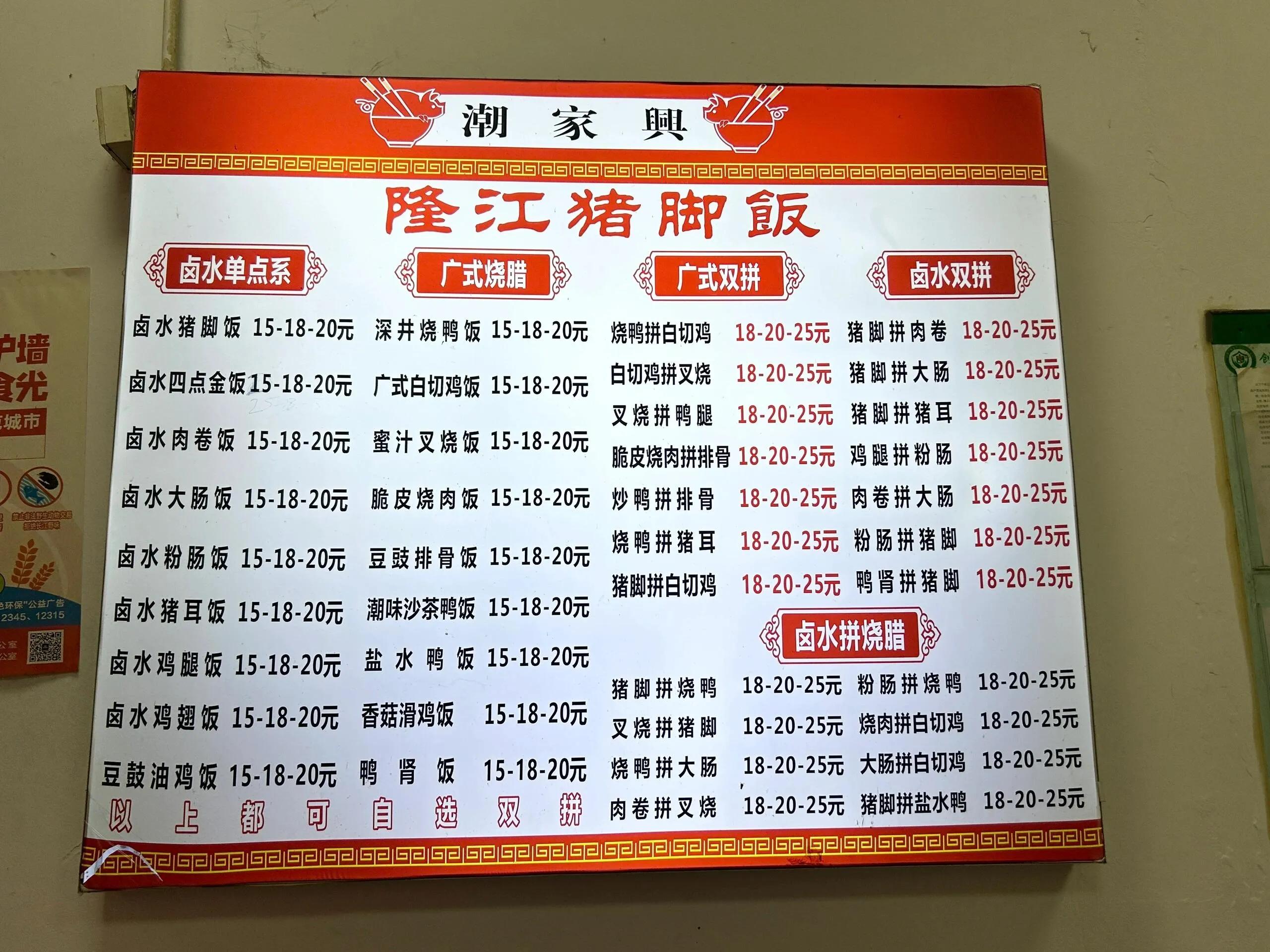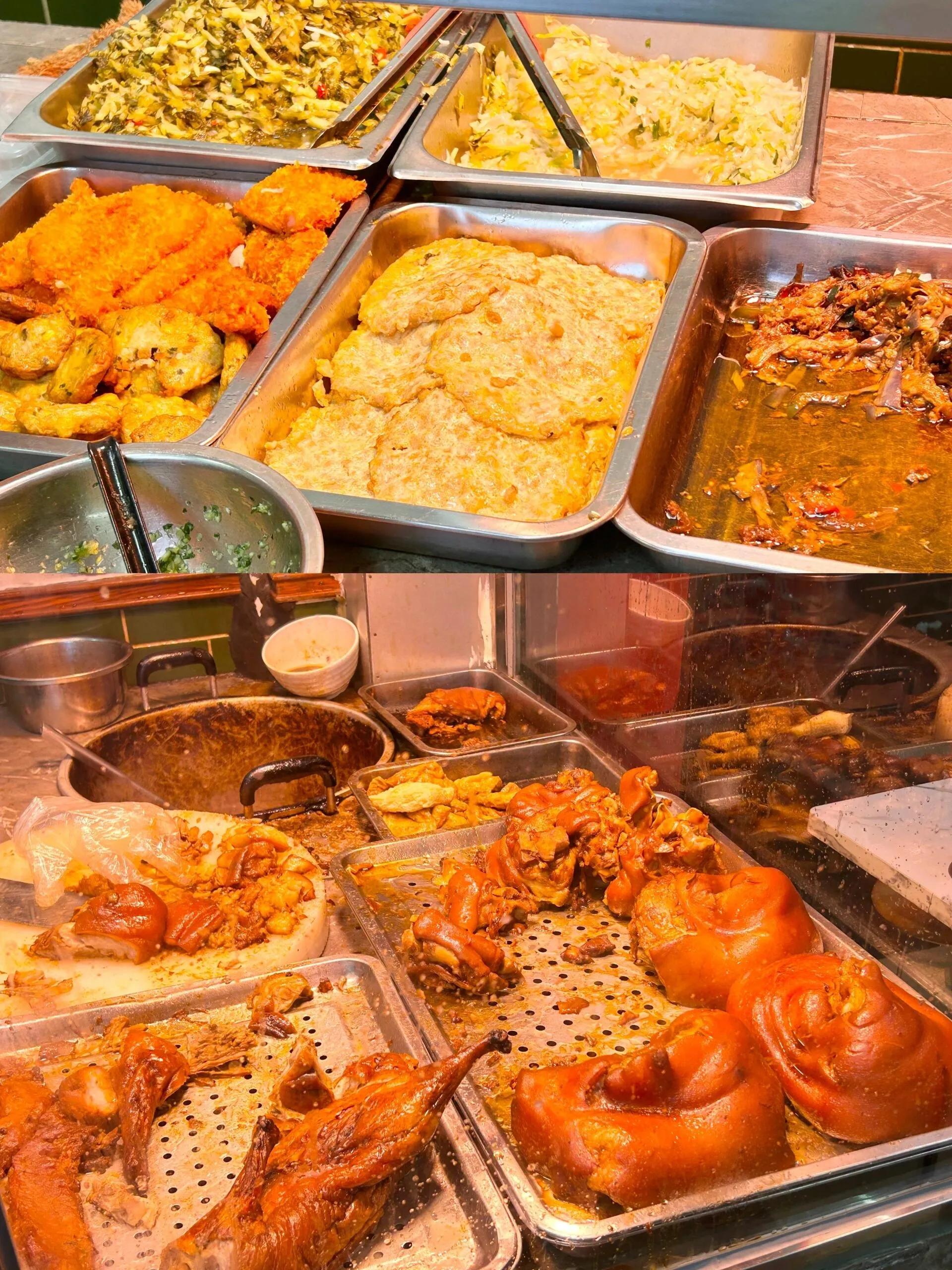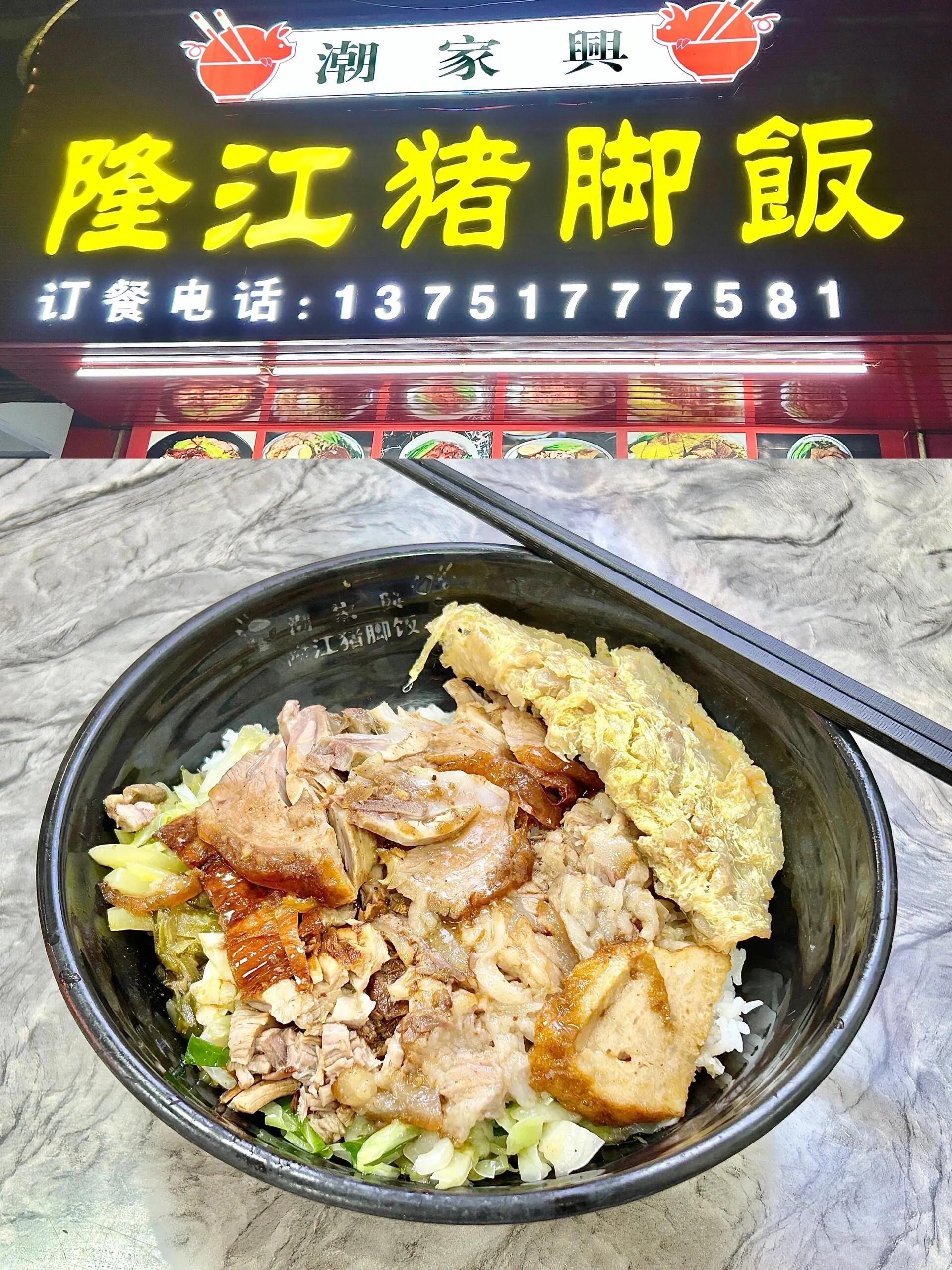 潮家兴·隆江猪脚饭是一家值得推荐的地道小店。 这里的 猪脚拼烧鸭饭堪称完美,价格实惠,卤味摆满柜台,非常诱人。 猪蹄膀肉质软烂入味,半肥半瘦的口感最为绝妙。烧鸭肉质紧实,搭配的包菜丝和酸菜不仅解腻还十分可口。建议再点一份萝卜干煎蛋,油香下饭,与主菜堪称绝佳搭配。