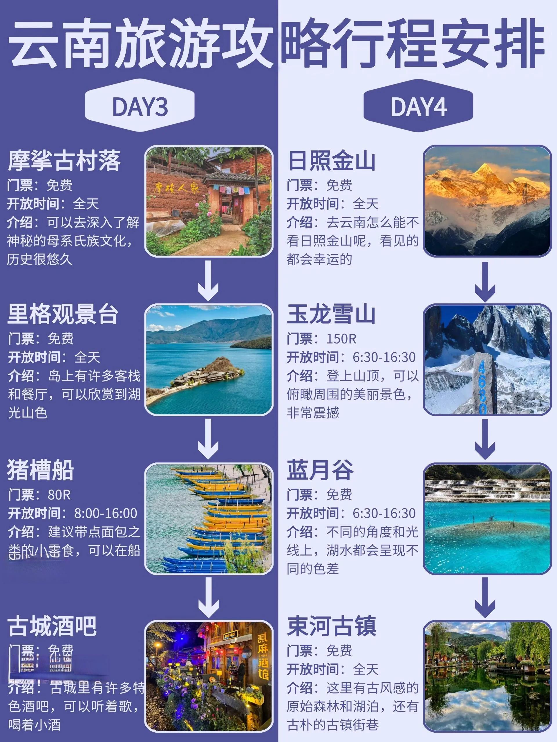 第五天:早起观赏日照金山,游玩玉龙雪山和蓝月谷,在束河古镇深度体验东巴文化。