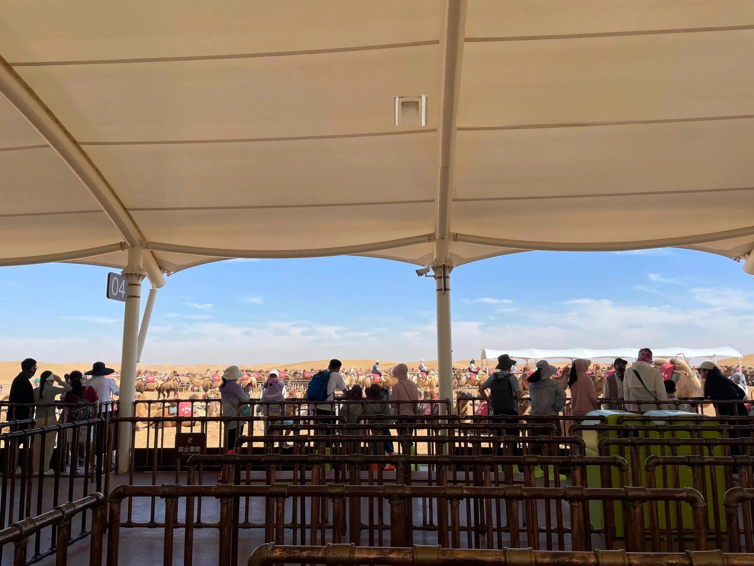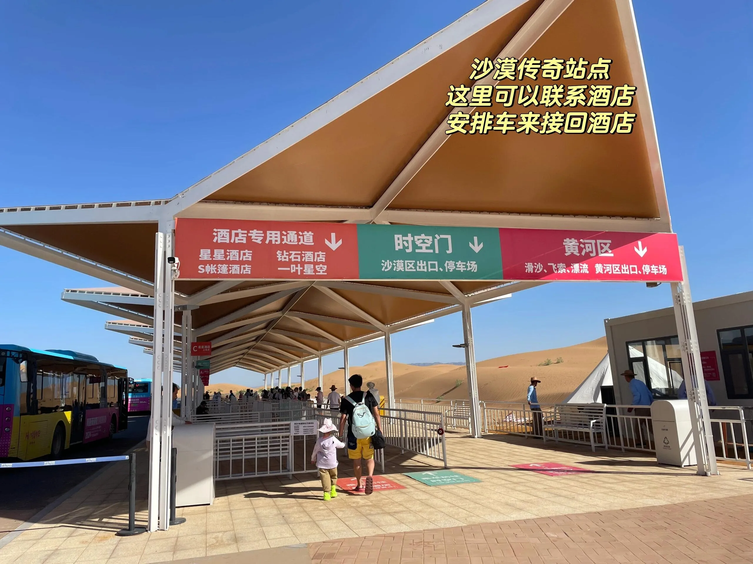 游玩建议从中卫市区出发,抵达沙坡头时空之门。对于入住星星酒店的游客,可以先在接待大厅办理入住手续并寄存行李。景区内需要乘坐大巴车到达各个区域,如沙漠传奇、黄河区等。