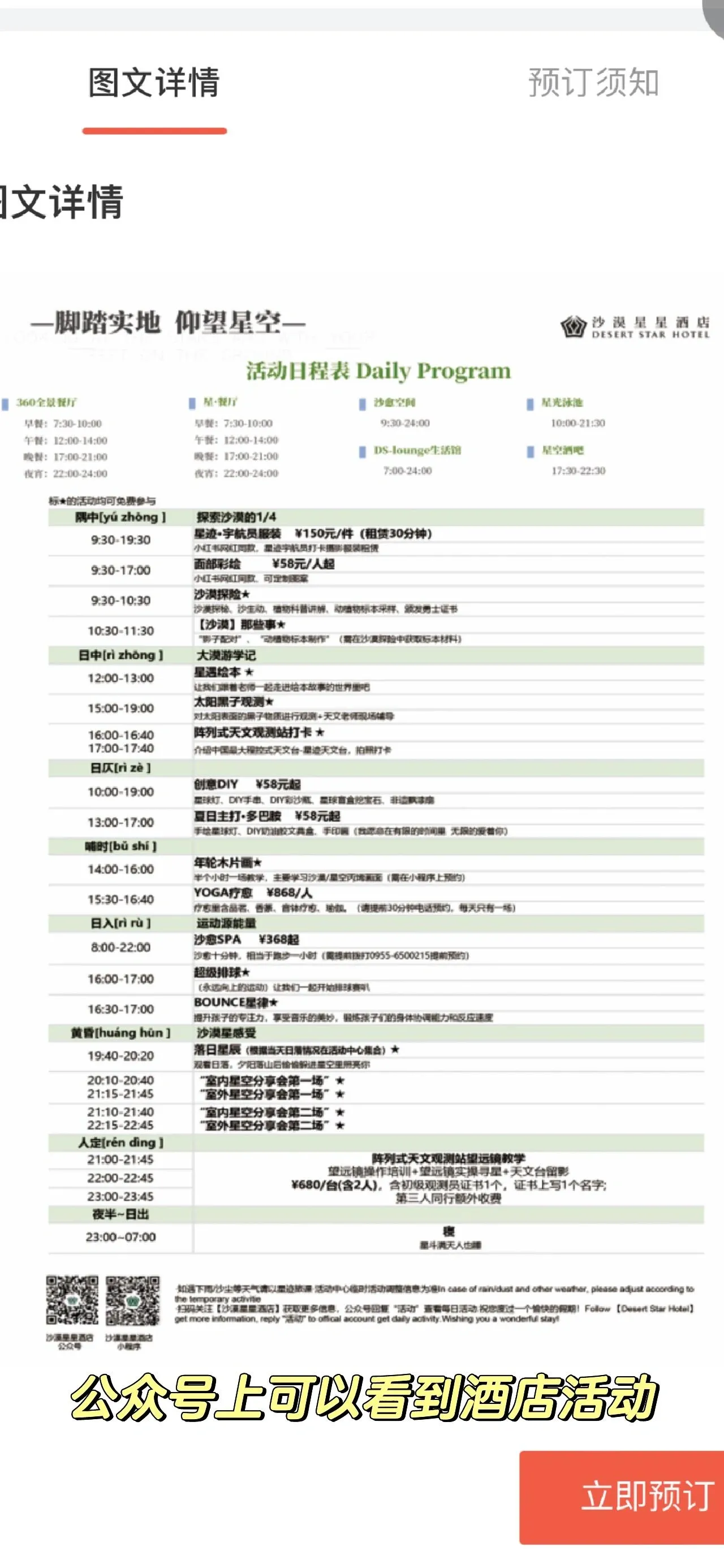 星星酒店是景区内的特色住宿 ,提供多种房型选择。高级木屋空间较大,周围环境安静,适合家庭入住。酒店提供滑沙板等公共设施,方便游客在沙漠中玩耍。酒店还设有露天泳池,但水温可能较低,建议根据个人情况选择是否体验。