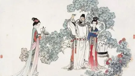 李白喝得醉眼朦胧,望向对面的女子,只见她用歌扇半掩俏脸,微红如月中云,此情此景,让李白心动不已。