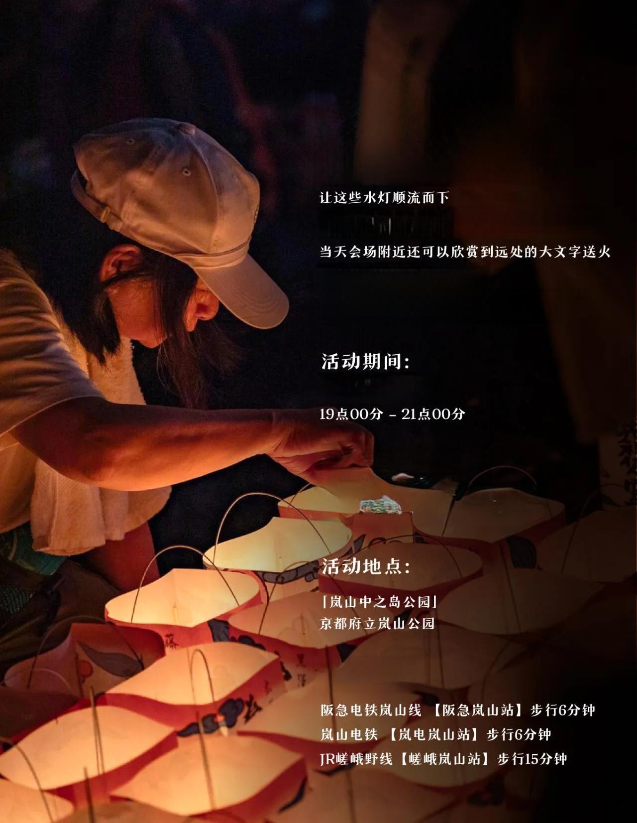 2024年的岚山水灯笼祭将于8月16日晚上7点到9点举行 。活动地点在京都府立岚山公园内的“岚山中之岛公园”。值得一提的是,入场是免费的,但 如果想要亲自放飘水灯,需要支付1200日元购买一个灯笼 。