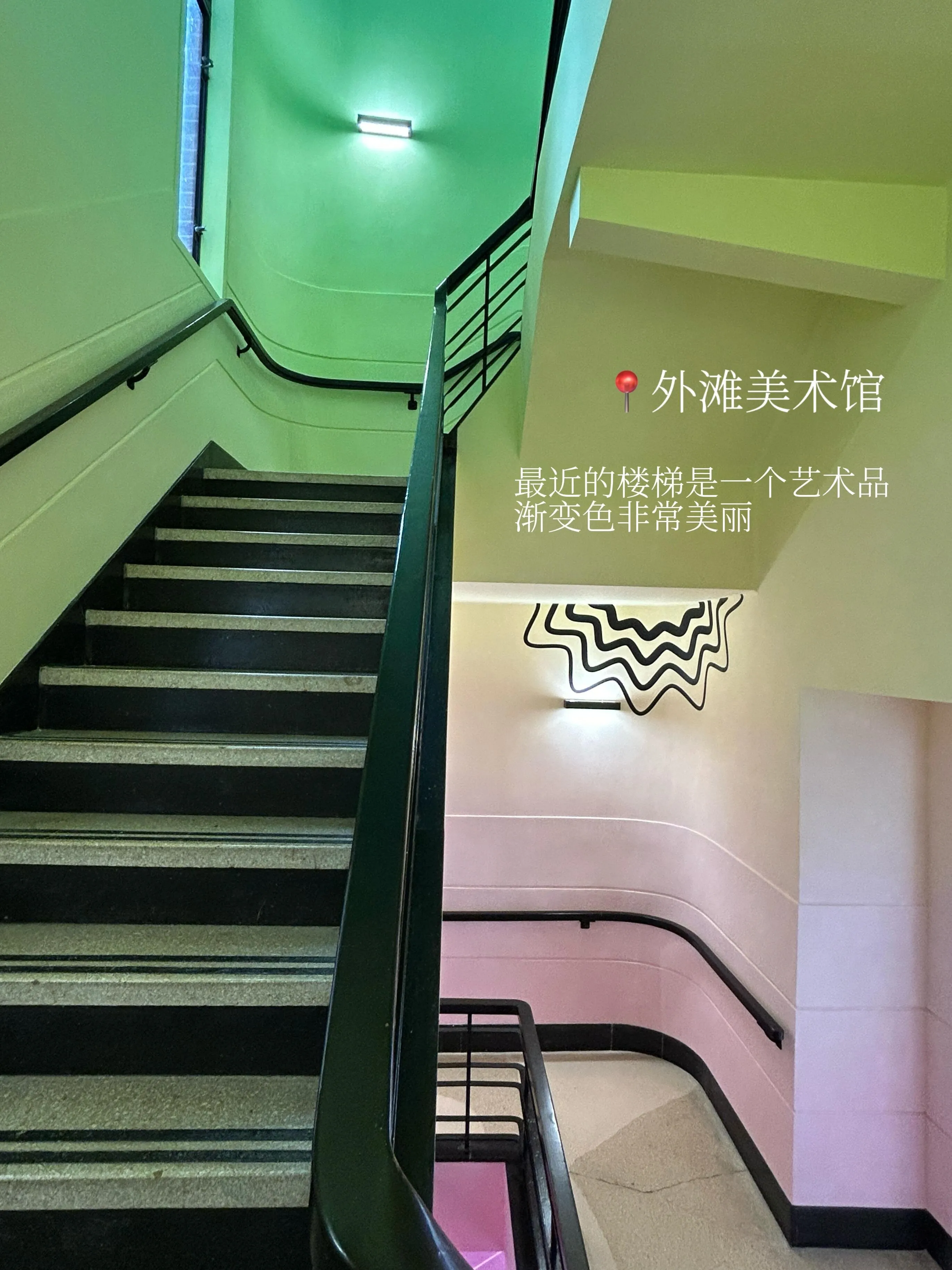 这是一家很国际化的美术馆。现在有瑞士艺术家的壁画作品,楼梯空间颜色渐变过渡,既迷幻有趣又适合拍照。美术馆楼下是洛克外滩源,那里有很多值得逛的小店。