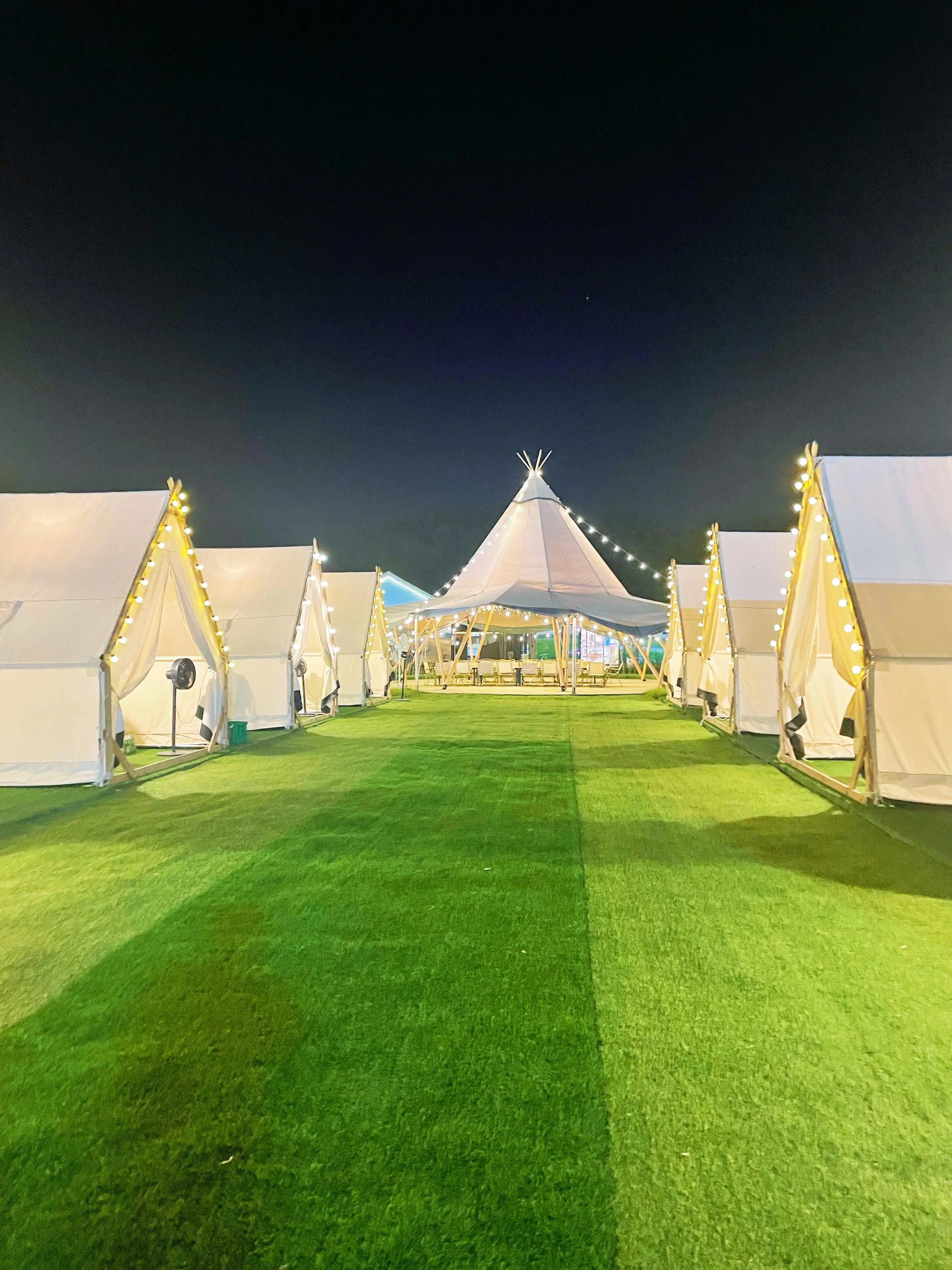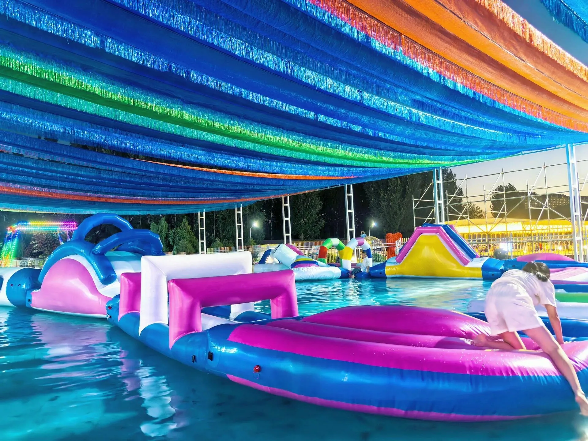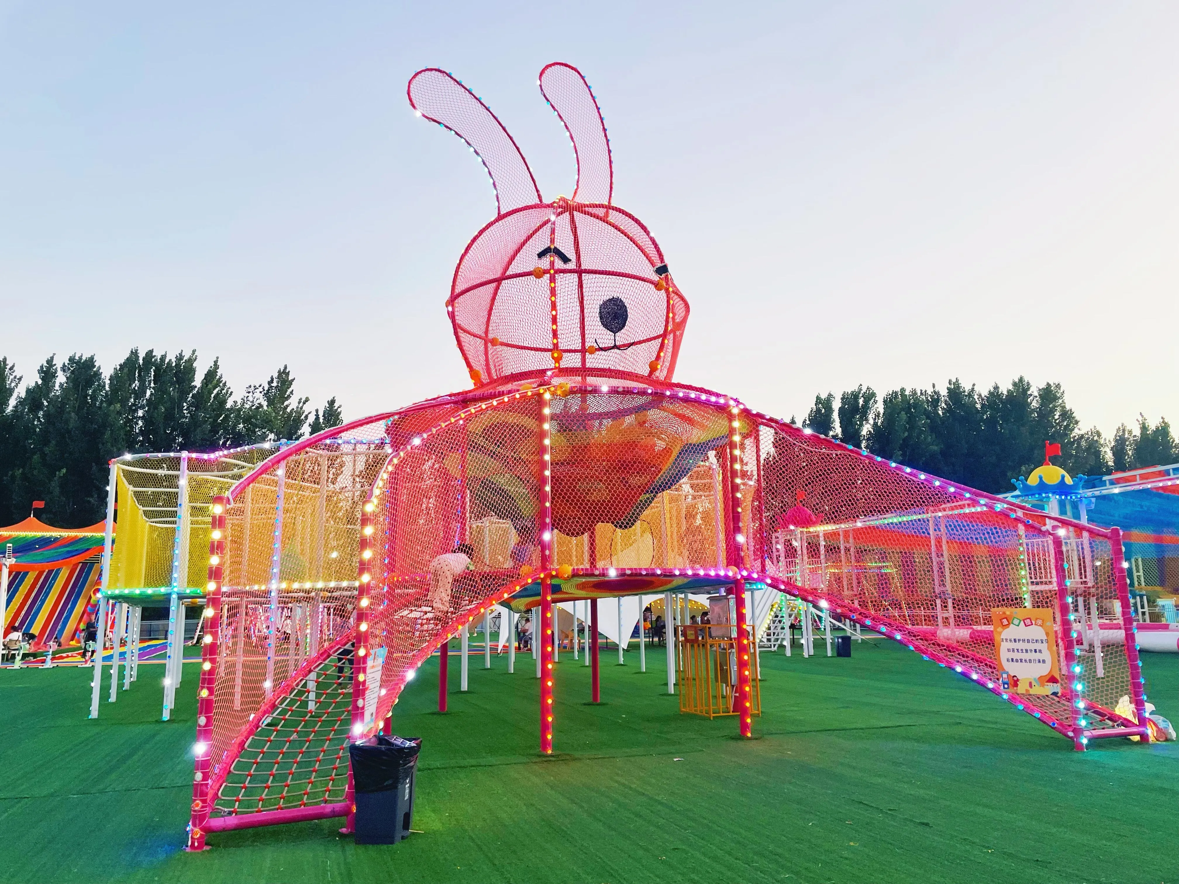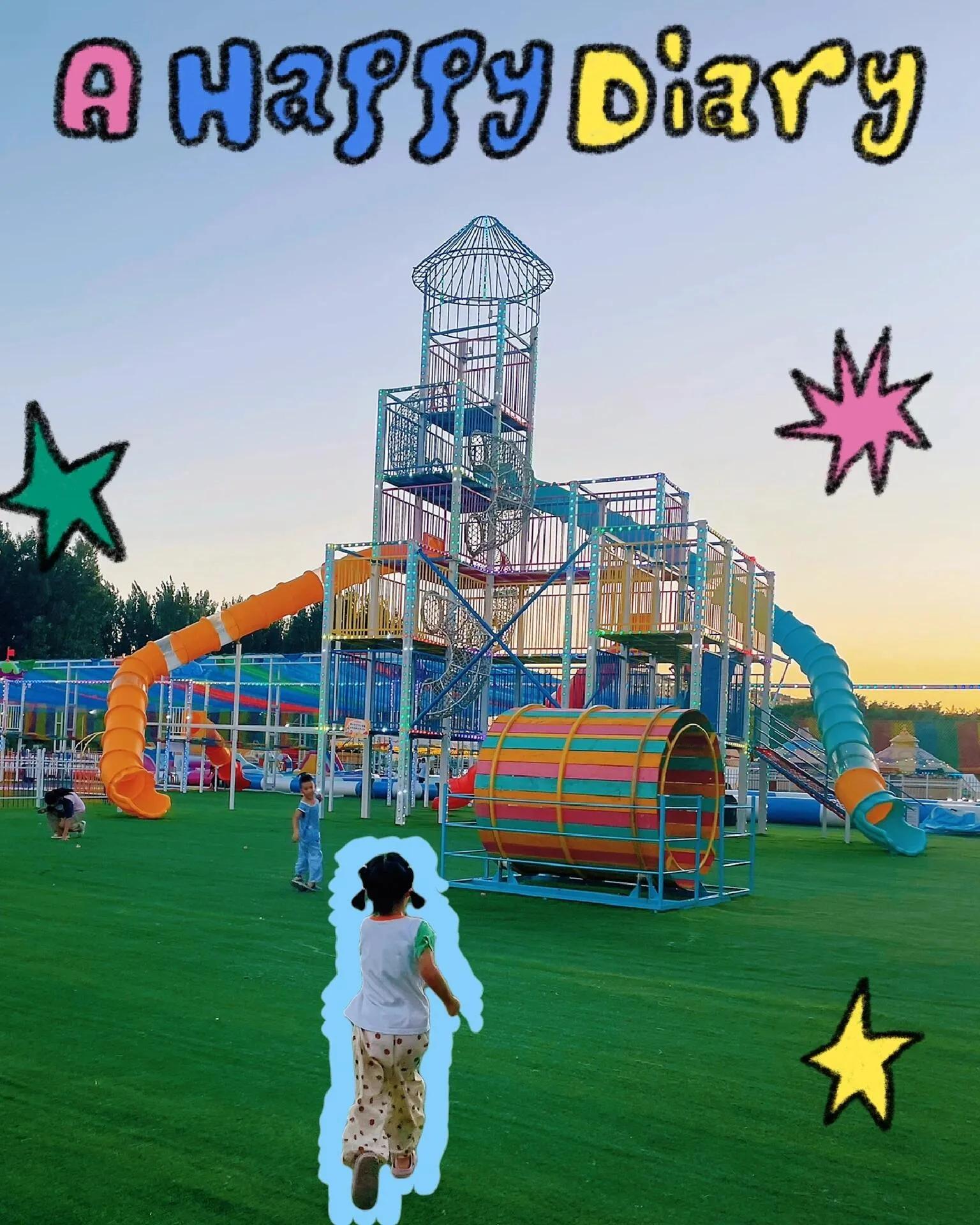 乐园内部设施丰富,有一片空场可以支帐篷,还有天幕和许多凳子 ,方便家长休息。夜晚时分,游乐设施上满是彩灯,照亮整个园区,让孩子们即使在天黑后也能尽情玩耍。