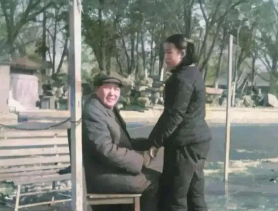 照片中,毛主席身穿一件厚棉袄,坐在椅子上,拉着女儿李讷的小手,流露出浓浓的父爱,显得非常慈祥。