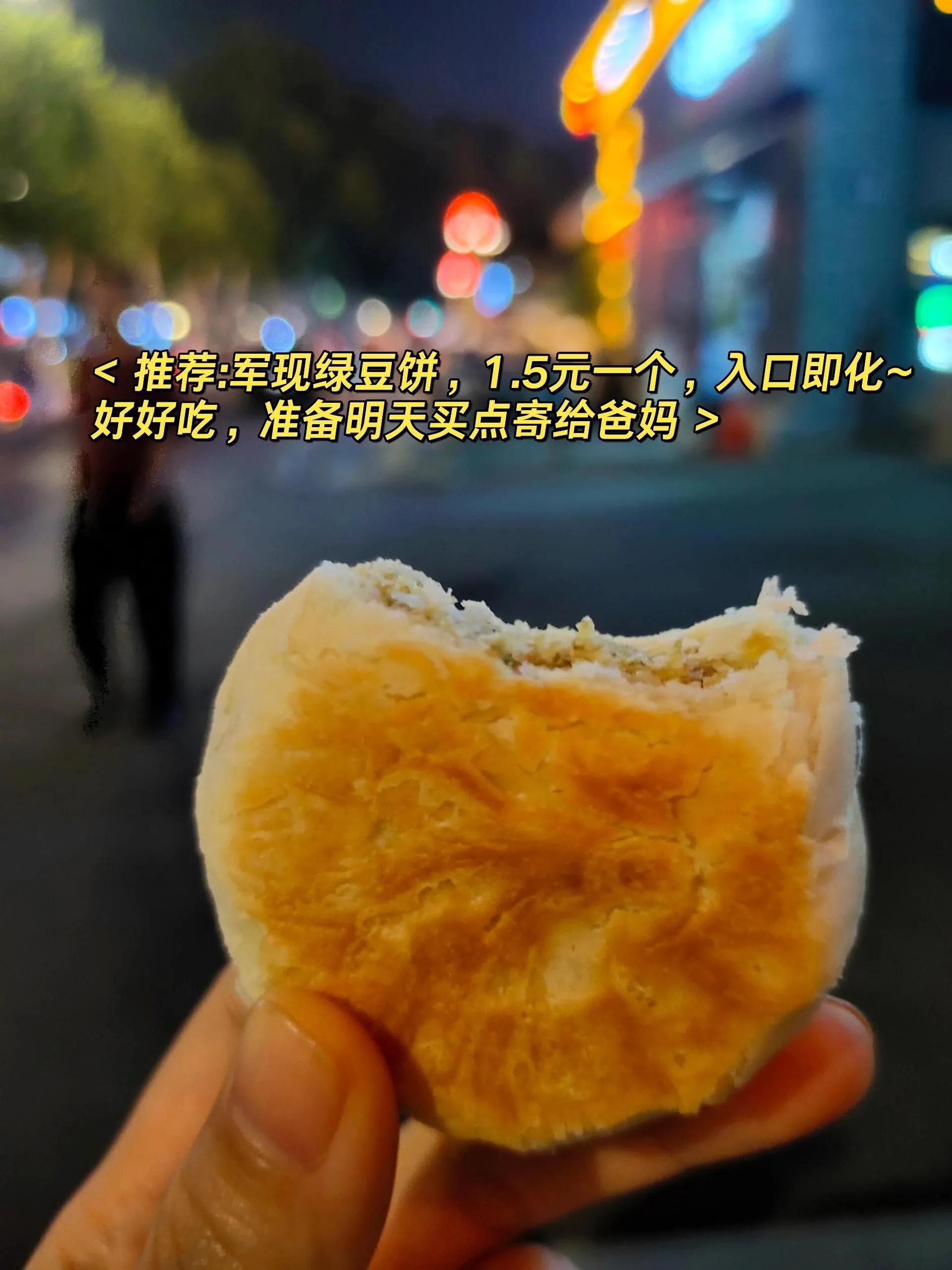 之前在大众点评上刷到评分很高,晚上在夜市附近刚好逛到,就买了两个。咬一口酥掉渣,绿豆入口即化,一点都不腻。明天准备买点寄给爸妈。