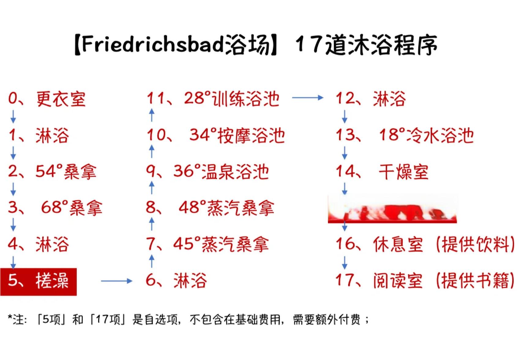 浴场的沐浴程序包含17个步骤 (如图3、4所示)。基础费用约为25欧元,其中 第5项和第15项需要额外付费。 第5项是一种简单的身体清洁服务,费用约为12欧元。第15项是全身乳液按摩,费用也在12欧元左右。这两项服务是否值得体验,可根据个人喜好决定。