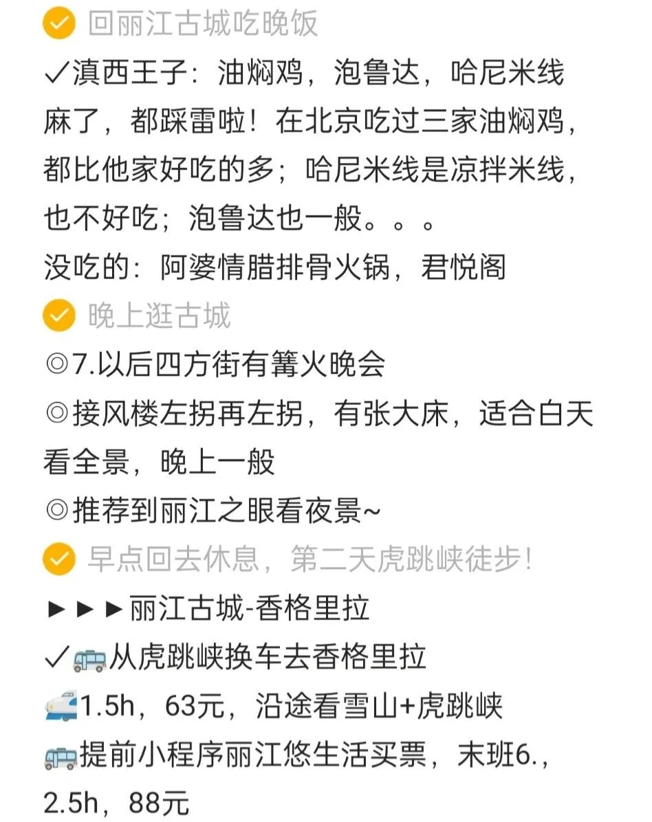 丽江古城是三个古城中最热闹最漂亮的一个,随处可见小桥流水和鲜花。虽然商业气息较重,但这也是古城的普遍现象。玉龙雪山虽然现在没有雪,但登顶体验仍然值得,蓝月谷的景色也很漂亮。整体而言,一天半的时间(古城半天+玉龙雪山一天)足以游览丽江的主要景点。