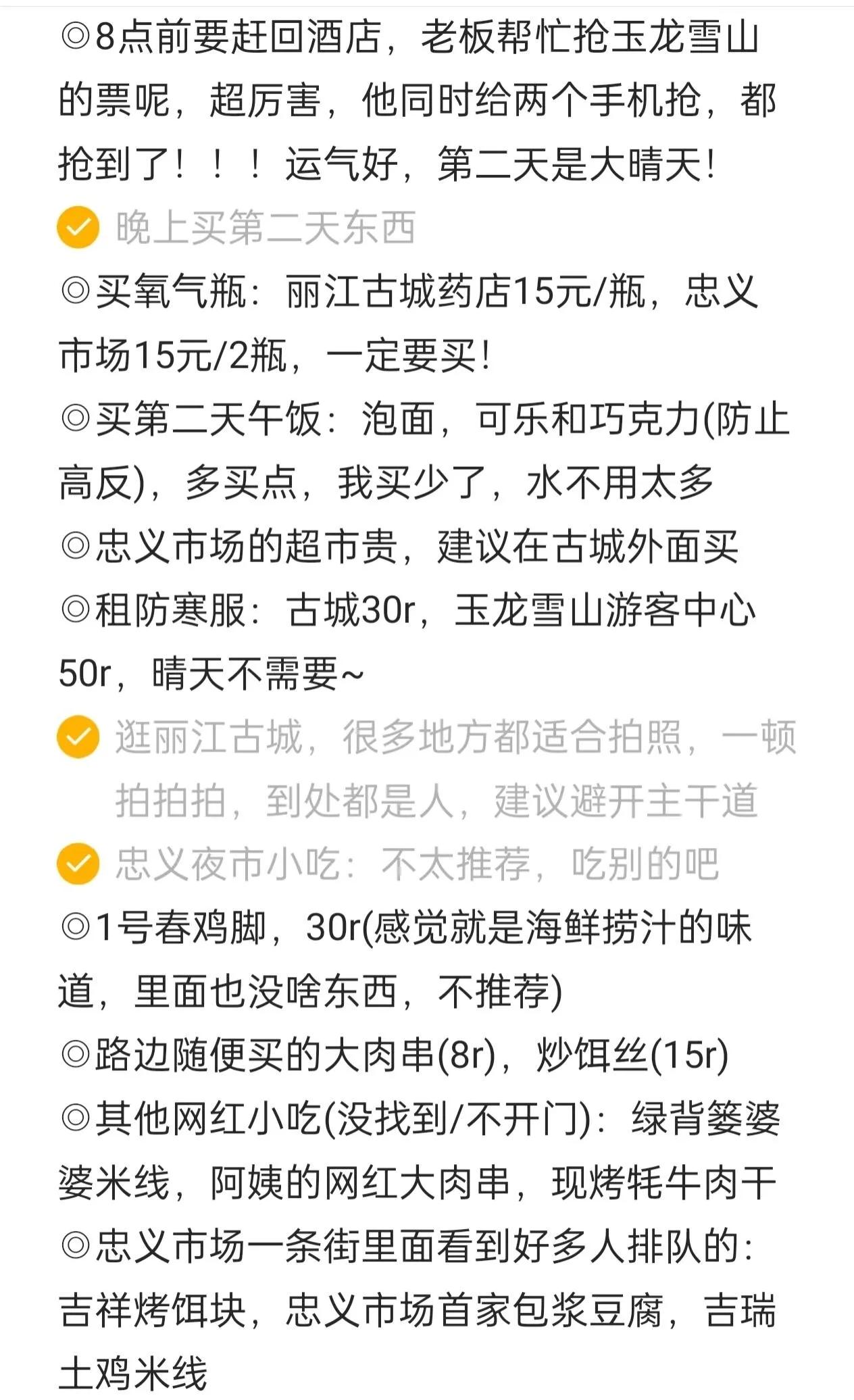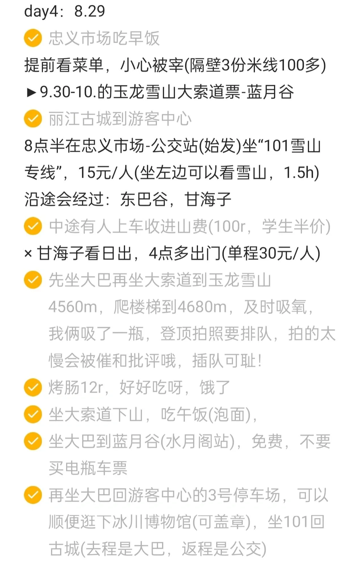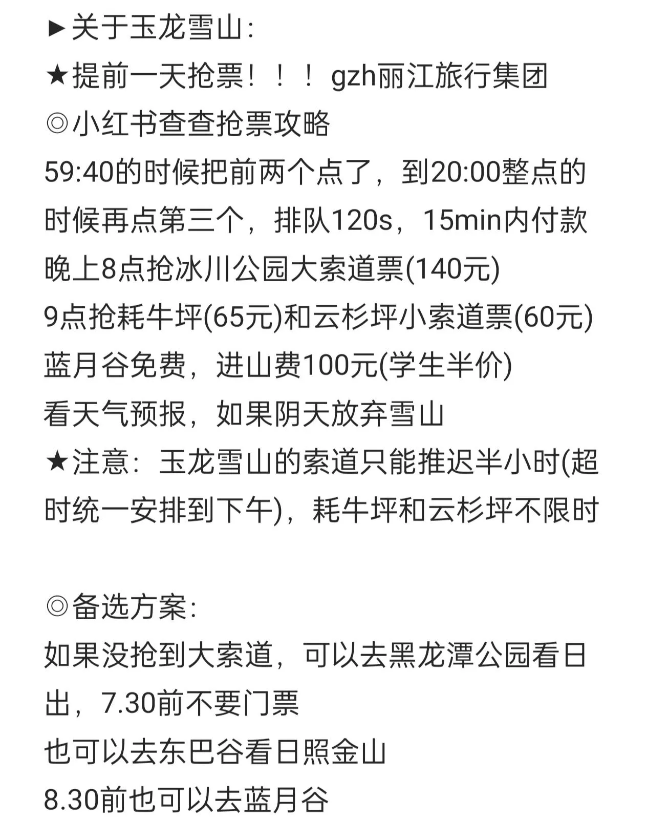 玉龙雪山游览需要提前一天通过“丽江旅行集团”公众号抢票。晚上8点抢冰川公园大索道票(140元),9点抢耗牛坪(65元)和云杉坪小索道票(60元)。蓝月谷免费,进山费100元(学生半价)。注意查看天气预报,阴天不建议前往雪山。