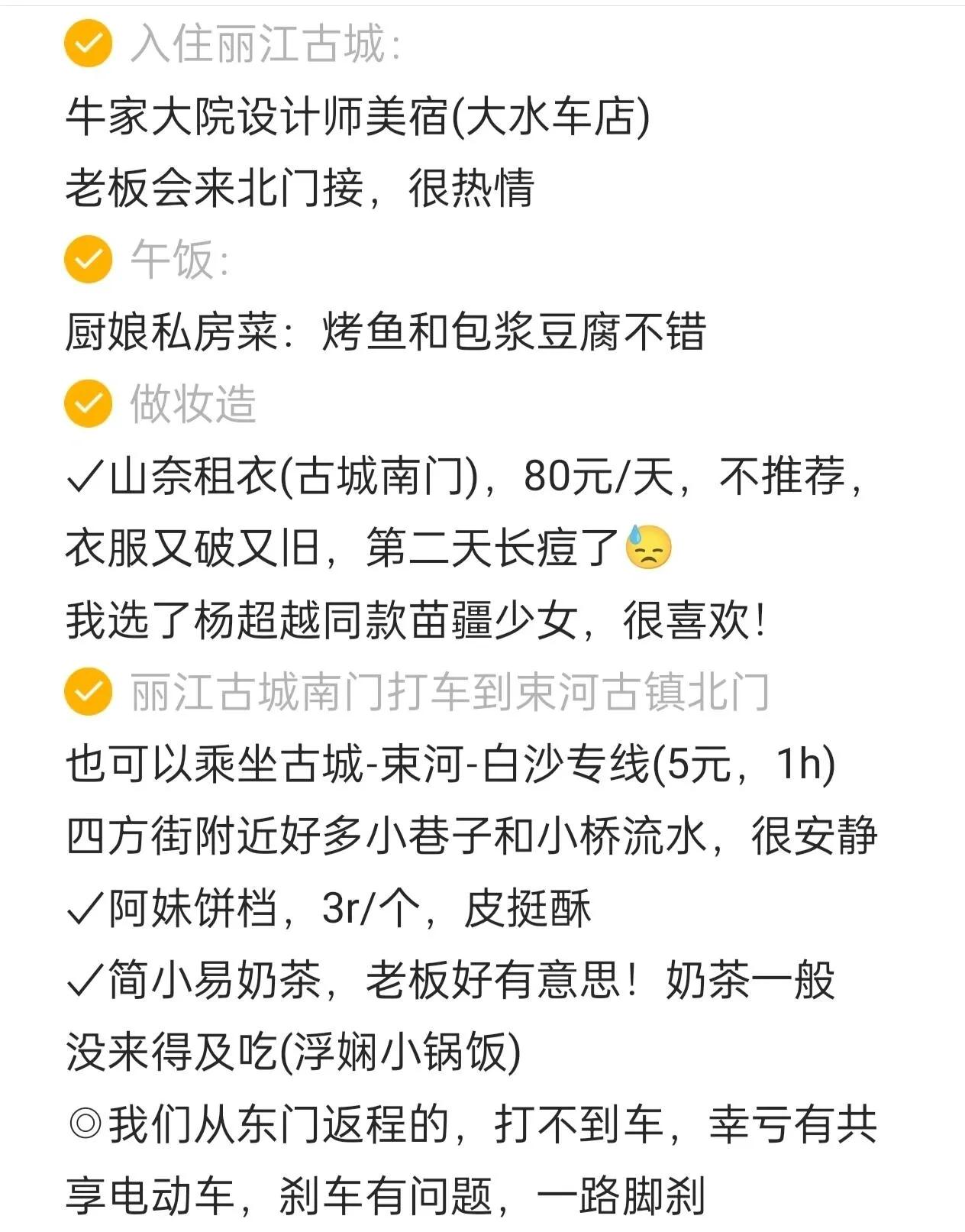 抵达丽江后,首先在民宿办理入住。午餐可以尝试民宿老板推荐的厨娘私房菜,味道不错。下午前往束河古镇拍照,这里比较安静,适合悠闲游览。