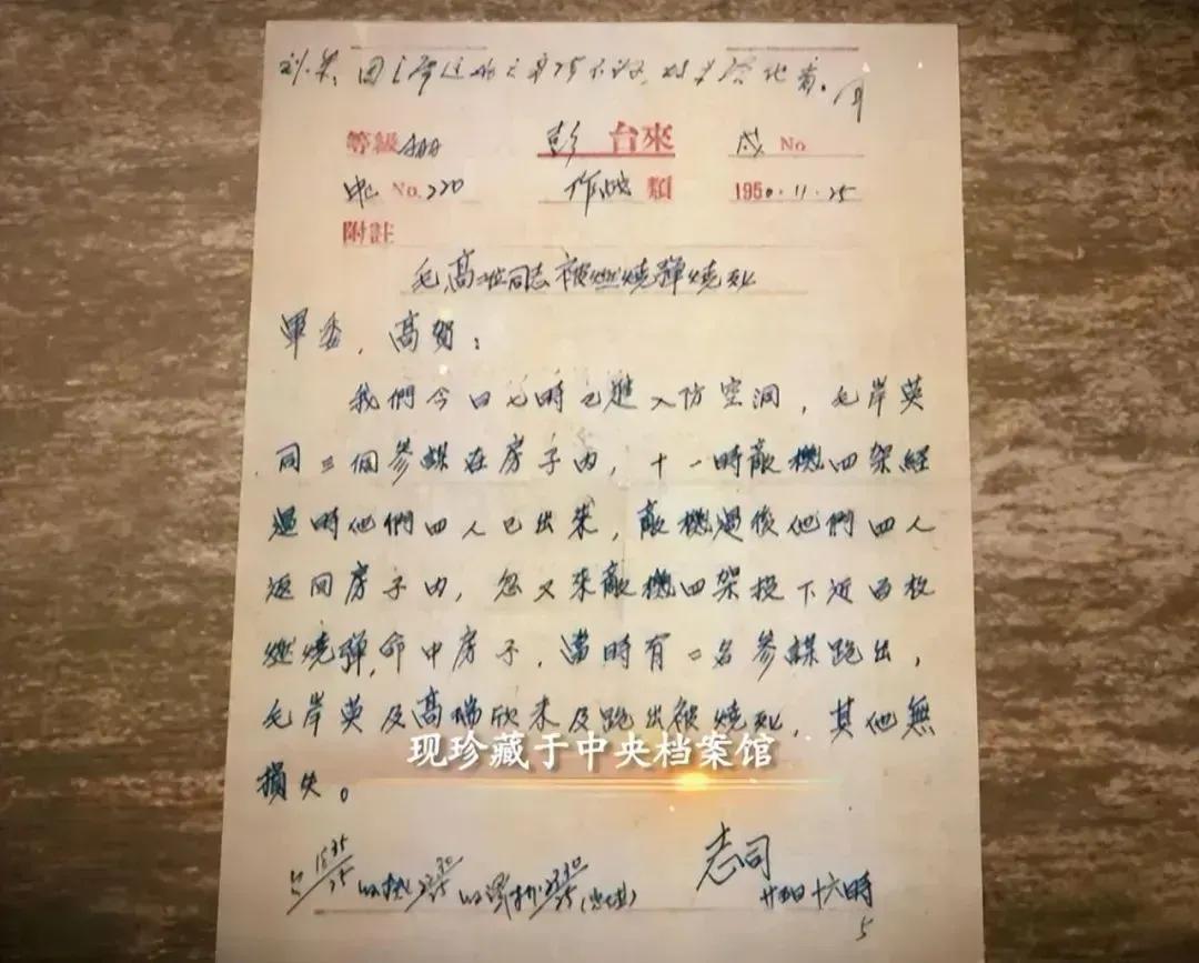 我们今日七时已进入防空洞,毛岸英同三个参谋在房子内,十一时敌机四架经过时他们四人已出来,敌机过后他们四人返回房子内,忽又来敌机四架,投下近百枚燃烧弹,命中房子,当时有二名参谋跑出,毛岸英及高瑞欣未及跑出被烧死,其他无损失。