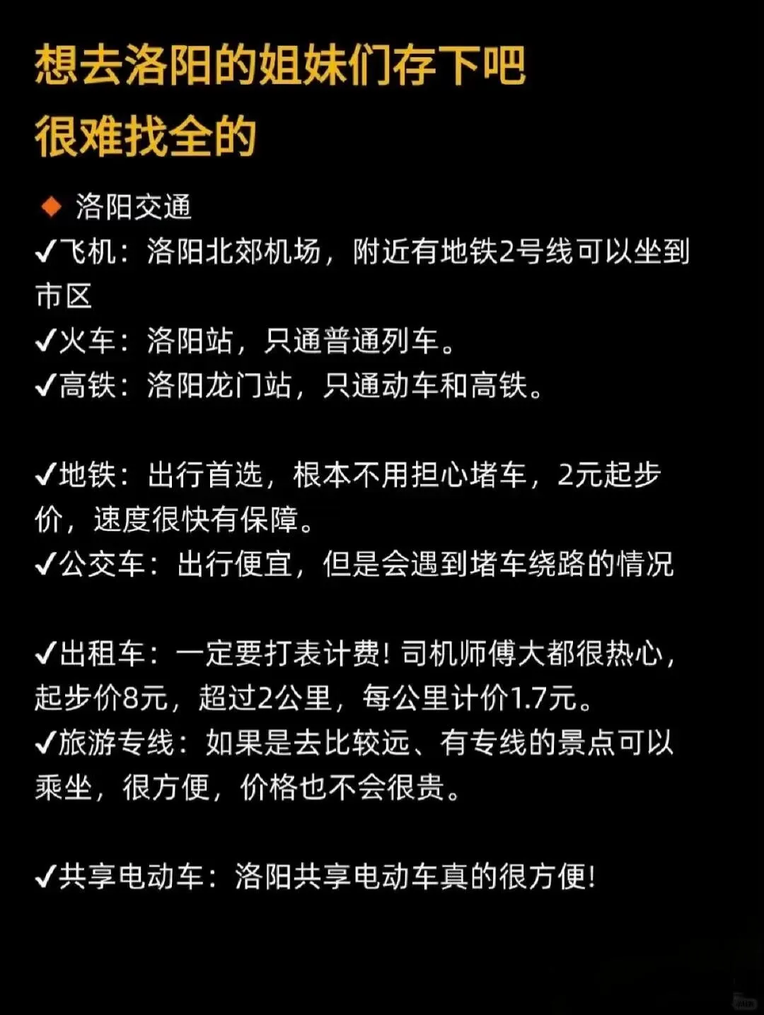 交通方面,洛阳有公交和2条地铁线路,还有共享电动车和自行车。出租车起步价8元,叫车很方便。