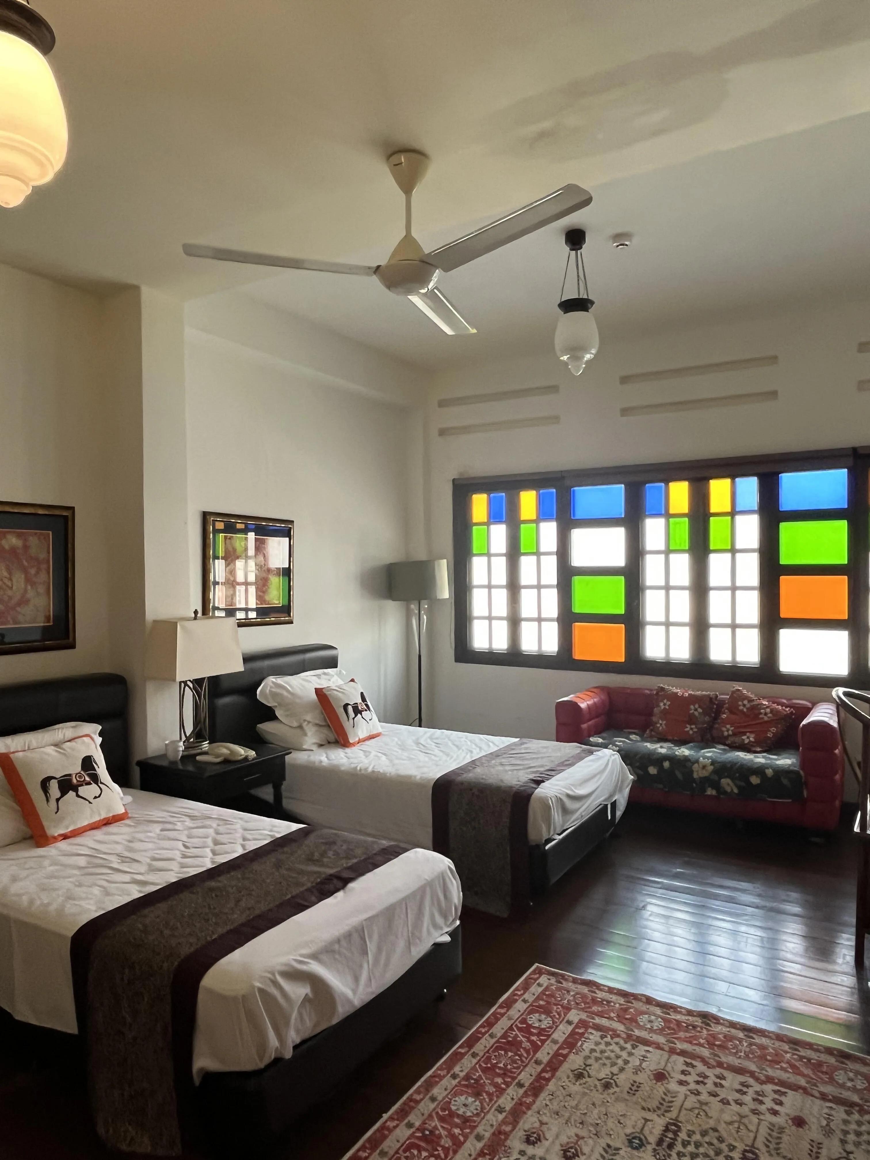 酒店的装修风格非常别致!红木掐金丝衣柜、复古小吊扇、斑斓绚丽的地毯、五彩琉璃窗,整体装修华丽中带着些许腐朽感。虽然能看出酒店已有些年头,地板走起来会发出咔吱咔吱的响声,但这反而增添了一份独特的韵味,非常适合喜欢体验不同风格的旅客。