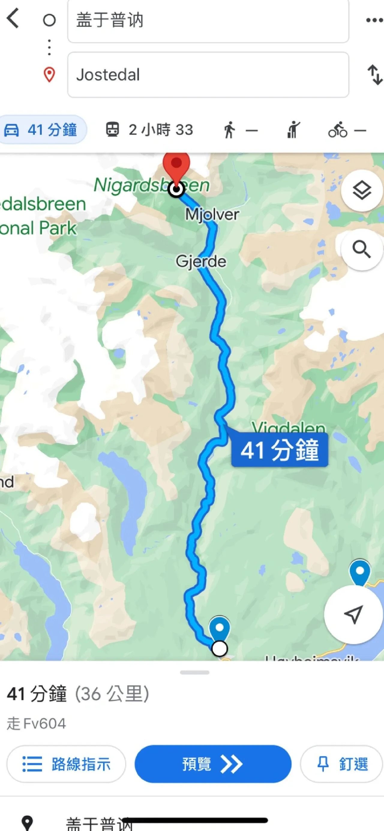 当天我们从Fv55公路抵达Gaupne小镇,转进Fv 604一路开约40分钟就会到冰川徒步集合点的停车场。公园会收取停车费,每台车是90挪威克朗。