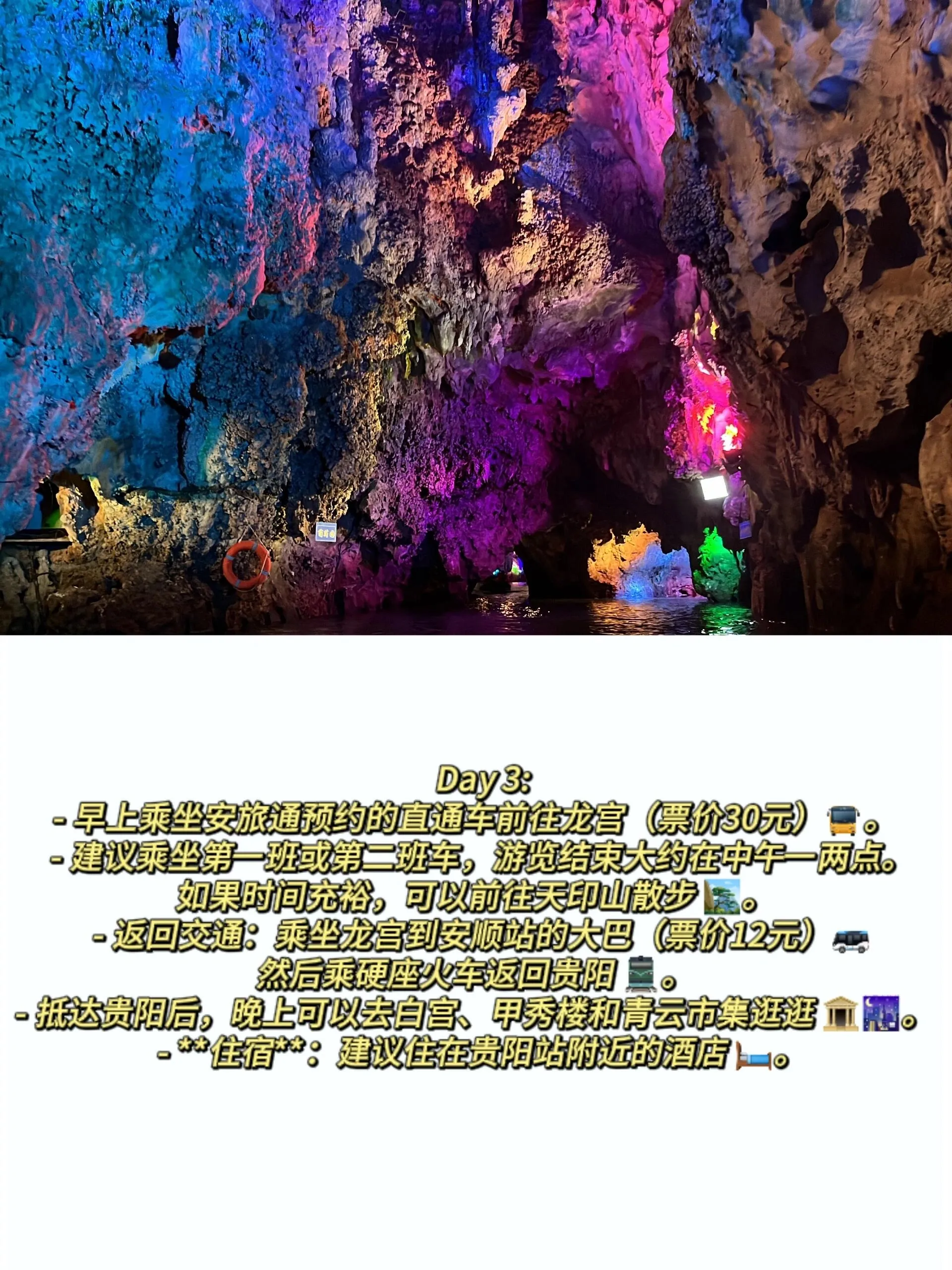 返程时乘坐龙宫到安顺站的大巴,票价12元,然后乘硬座火车返回贵阳。抵达贵阳后,晚上可以去白宫、甲秀楼和青云市集逛逛,感受贵阳的夜生活。