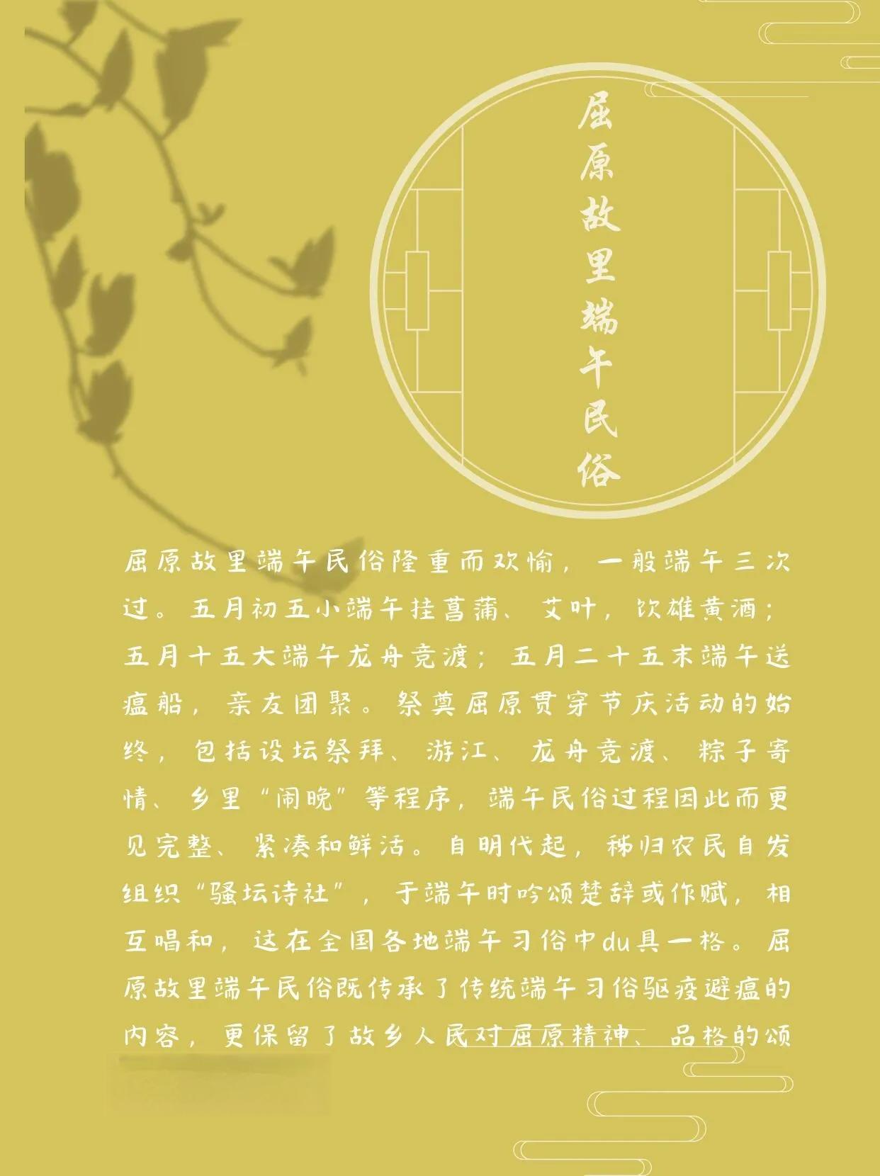 屈原故里的端午民俗有“三次过”的传统:五月初五小端午,人们会挂菖蒲、艾叶,饮雄黄酒;五月十五大端午,举行龙舟竞渡;五月二十五末端午,送瘟船,亲友团聚。整个庆祝活动贯穿始终的是对屈原的祭奠,包括设坛祭拜、游江、龙舟竞渡、吃粽子等环节,使得端午民俗更加完整、紧凑和生动。