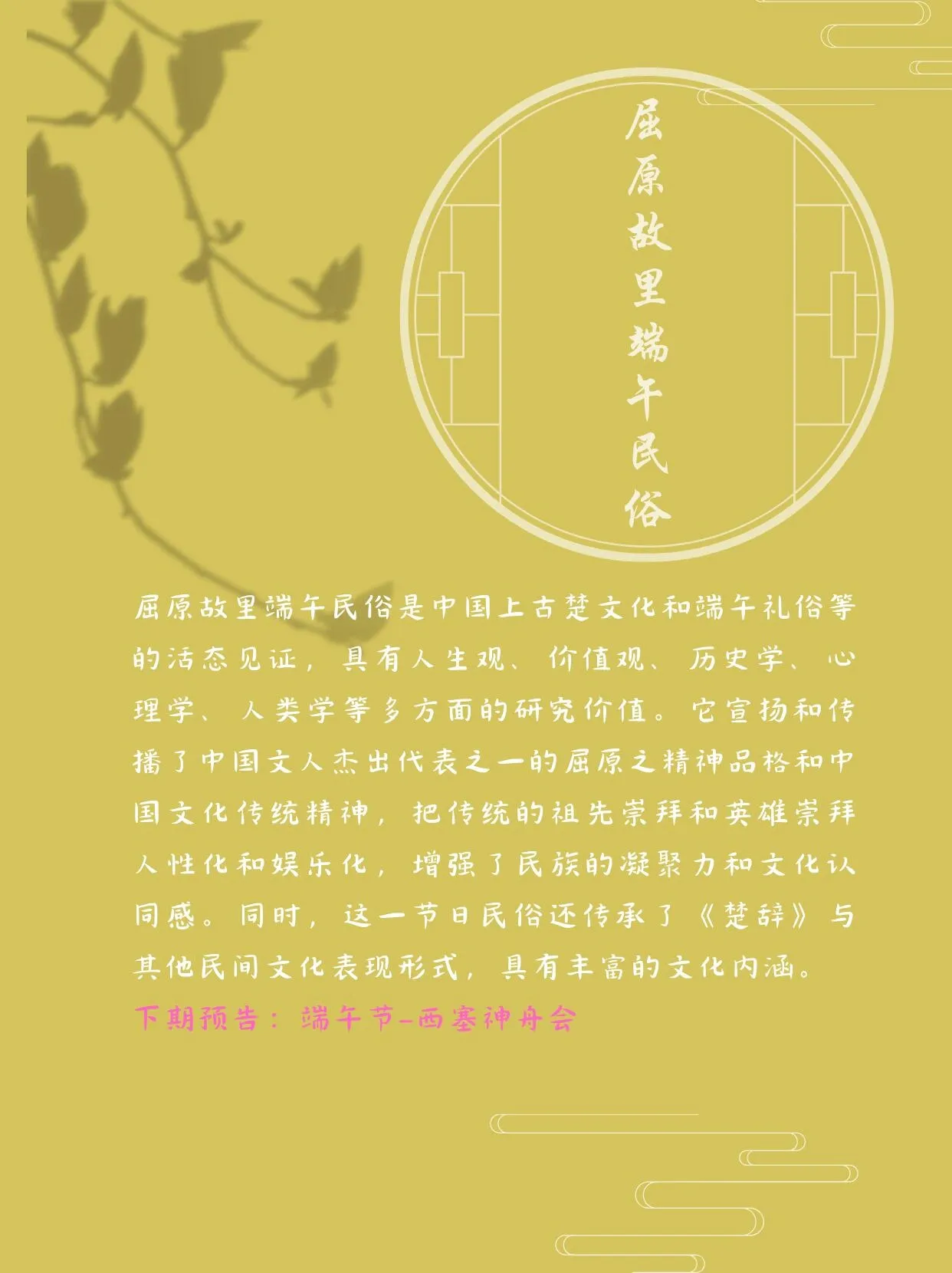 这一独特的民俗是中国上古楚文化和端午礼俗的活态见证,具有多方面的研究价值。它不仅传播了屈原的精神品格和中国传统文化精神,还将传统的祖先崇拜和英雄崇拜人性化和娱乐化,增强了民族的凝聚力和文化认同感。同时,这一节日民俗还传承了《楚辞》与其他民间文化表现形式,蕴含丰富的文化内涵。