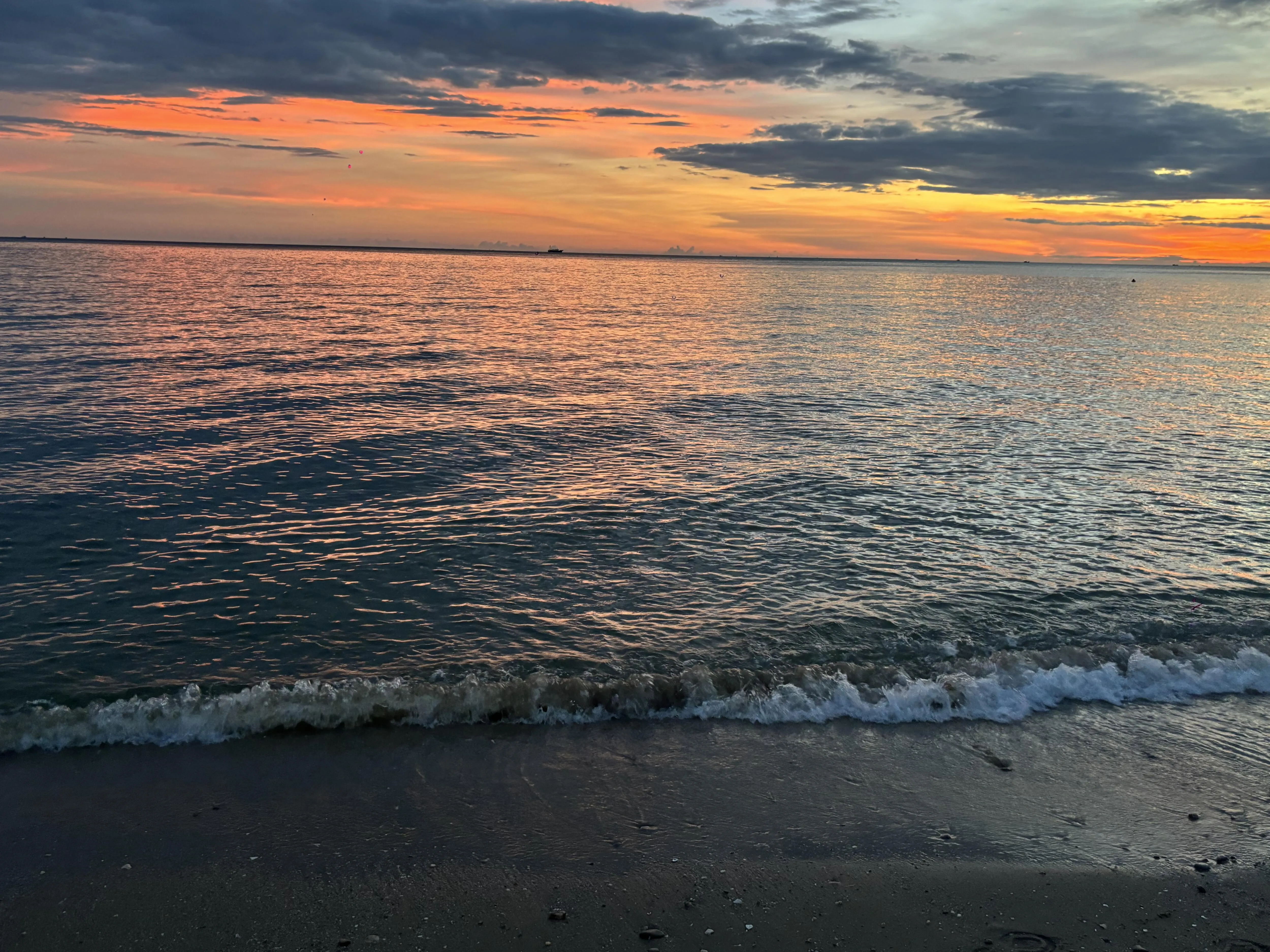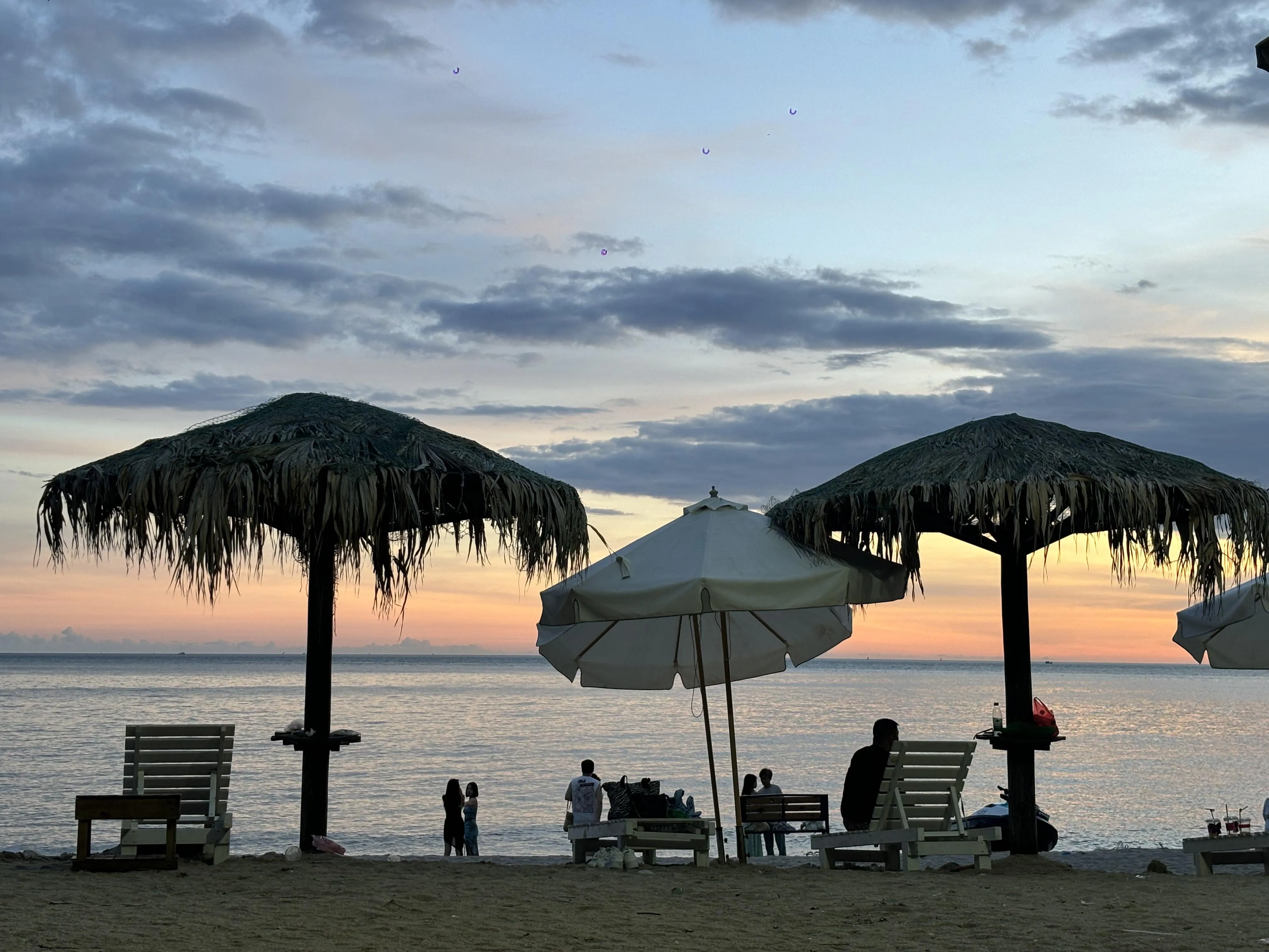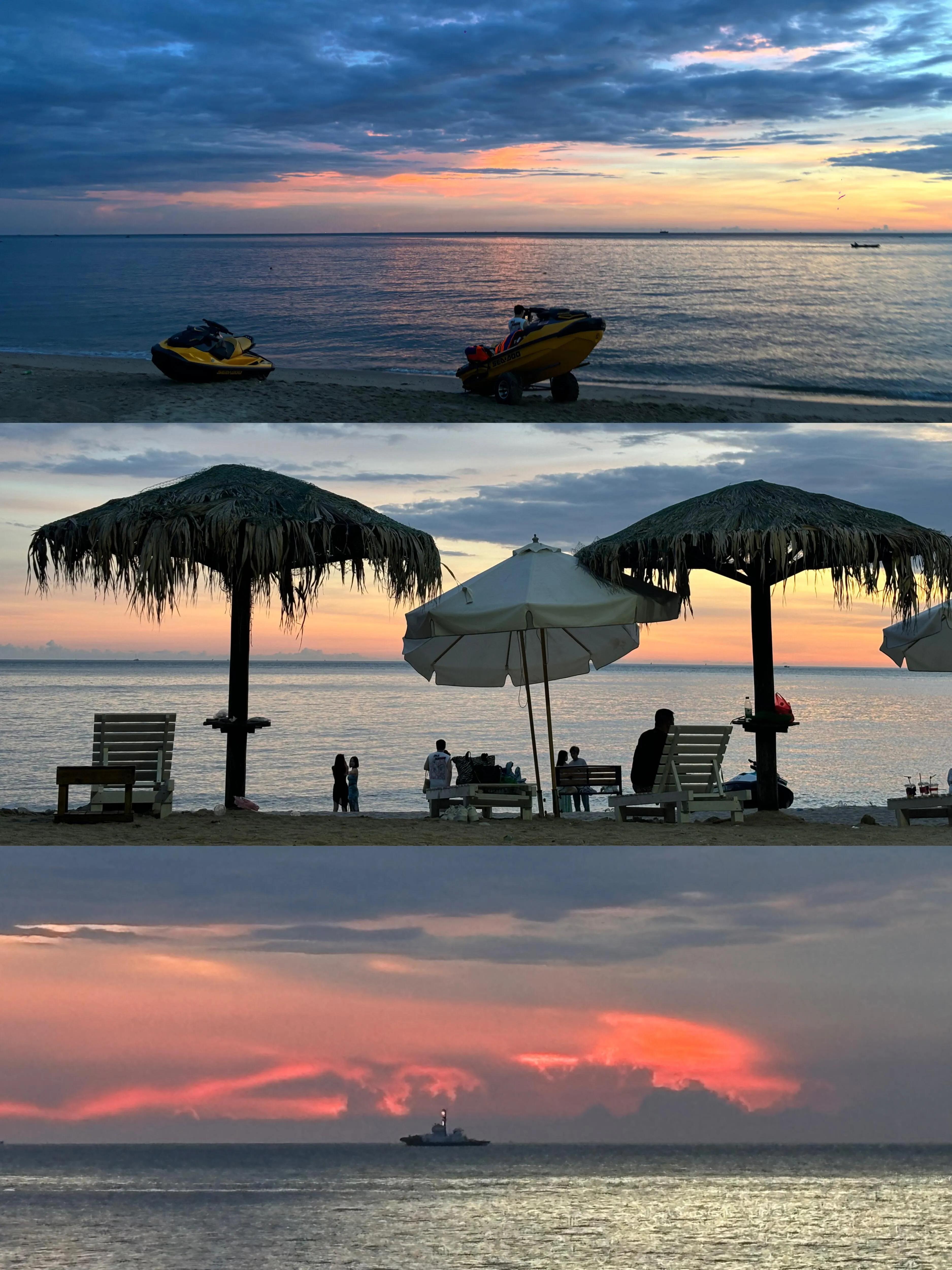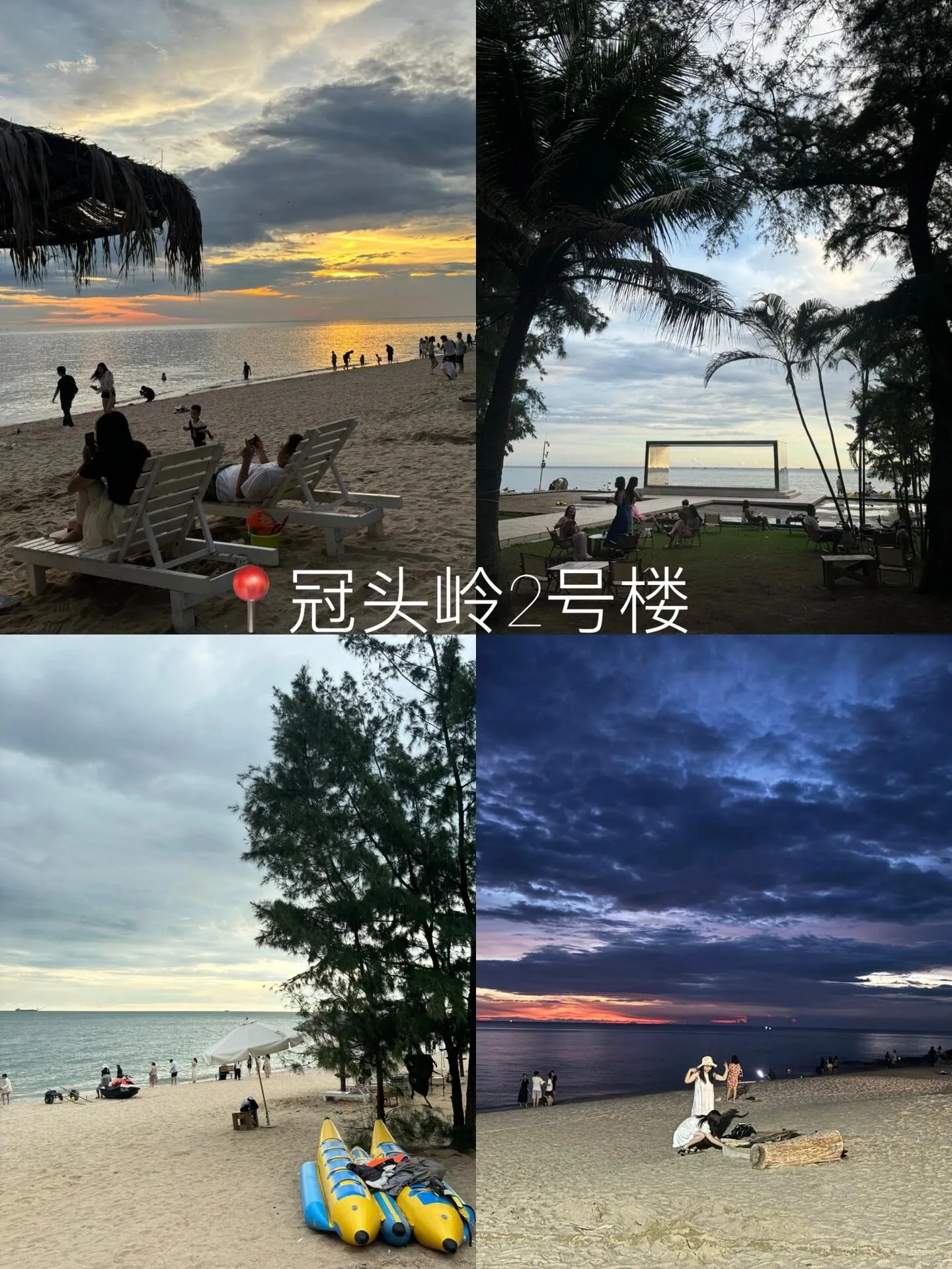 接下来可以前往冠头岭海滩。 这里的环境比紫霞湾要好得多,有粉色沙发、岩石和灯塔,还能看到美丽的日落晚霞。海边有餐饮吧,还可以付费玩摩托艇。建议避开紫霞湾海滩,那里环境较差,海水浑浊且有垃圾。