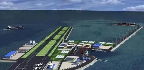 这种排水量十万吨以上的浮动平台,在战时能扩展成容纳数百架战斗机的海上超级军用机场。