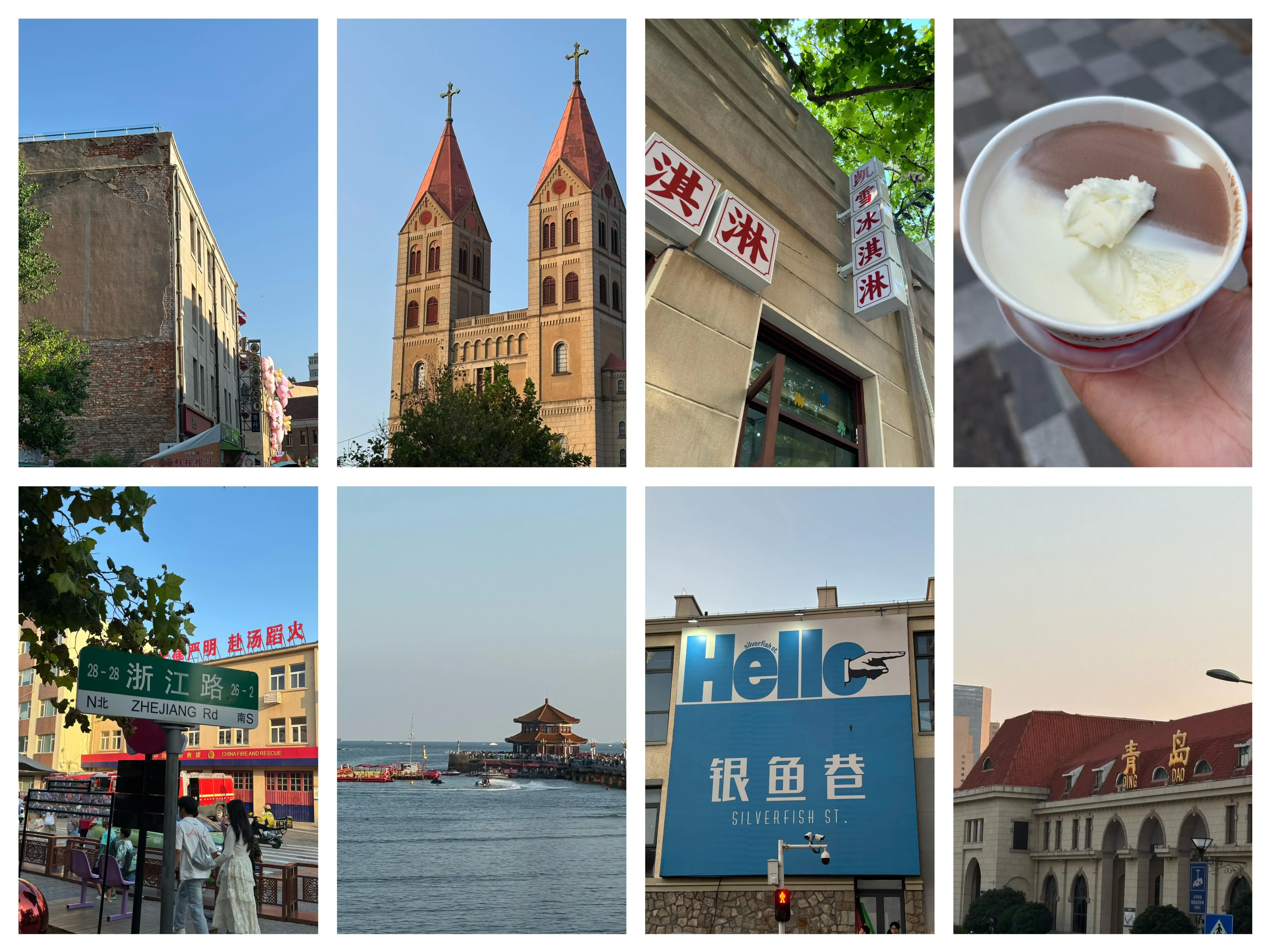 随后前往中山路,途经浙江路时拍照留念。参观了天主教堂外观,虽然教堂本身显得有些孤立。品尝了凯雪冰淇淋,可惜没能尝到薄荷味。在人头攒动的栈桥留影,感受这座城市的标志性建筑。