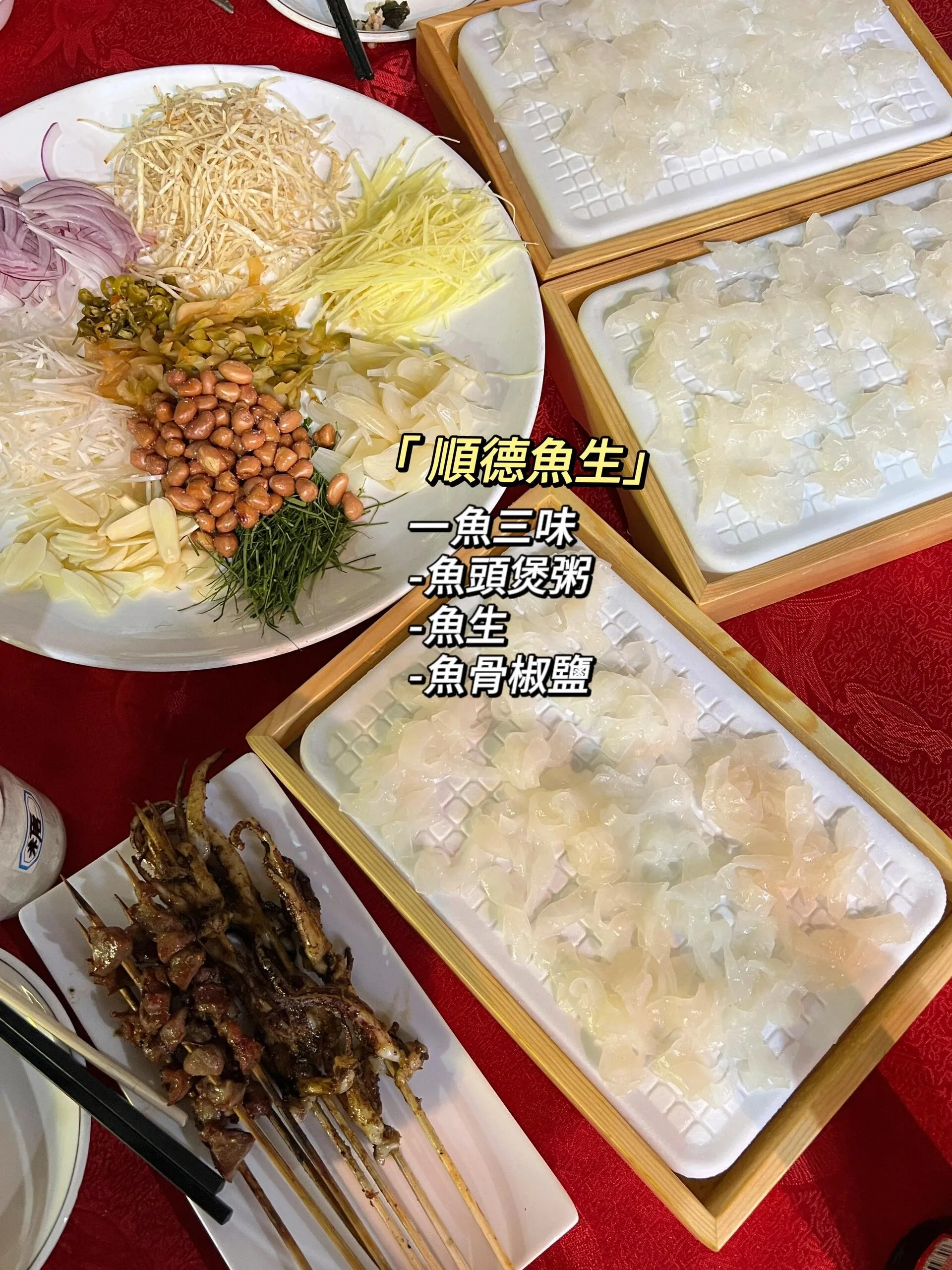 我们去的是水围夜间经济示范街,虽然不确定是否去对了地方,但逛起来很快就能逛完。买了些小吃,在街口的“顺德鱼生”用餐。夜市买的脆皮烧肉特别好吃。因为人多,每样都尝一点就吃撑了。