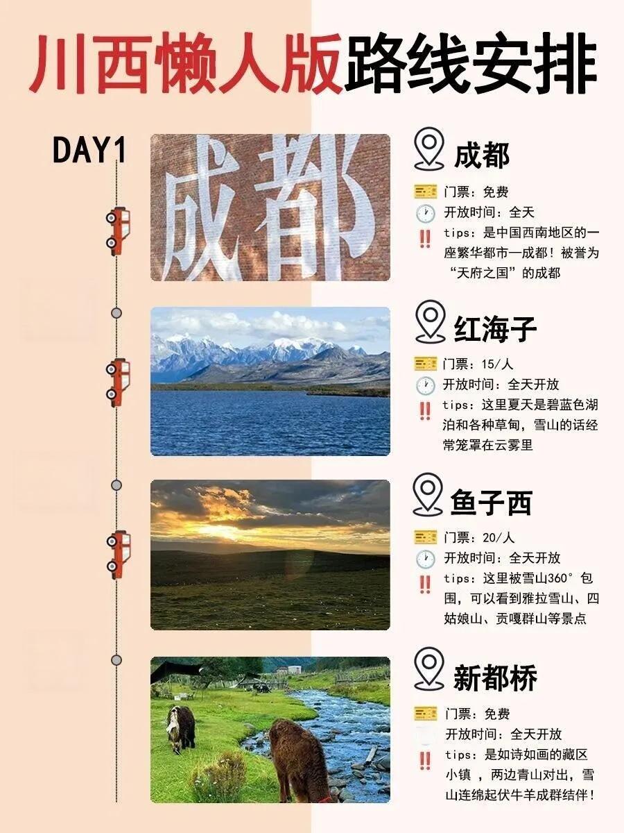 川西小环线是一条经典的4天3晚行程 ,涵盖了川西多个精华景点,包括鱼子西、四姑娘山、色达、塔公草原和墨石公园。这条路线可以让游客欣赏到日照金山、山川湖泊和草原森林等多样的自然风光。