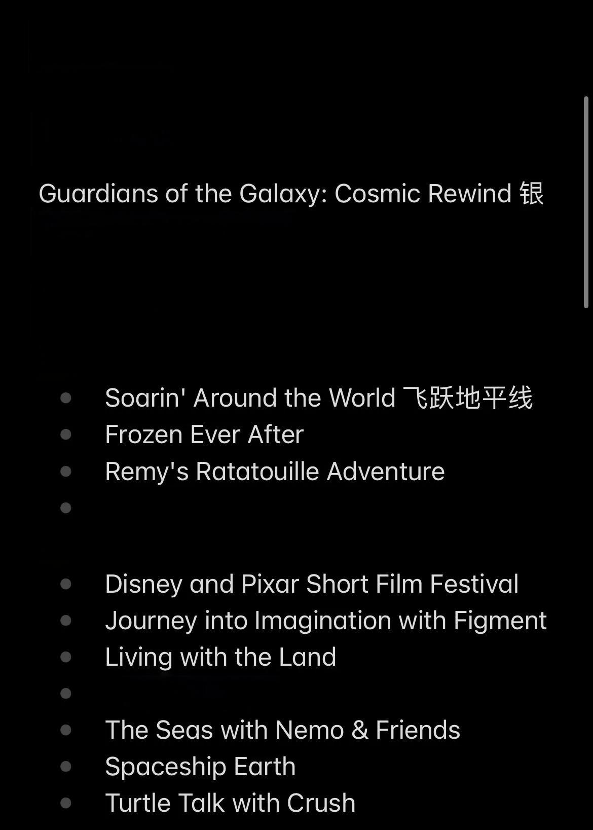 Epcot:类似世博会,汇集了各国著名景点的微缩版。主要以逛吃为主,推荐项目有银河护卫队、料理鼠王和飞跃地平线。