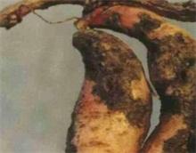 黑斑病主要危害红薯的块根及幼苗茎基部,不侵害绿色部位。在苗期,受害严重的幼苗可能未出土就烂在土中。出土后的病苗生长不旺,茎基部形成黑褐色梭形或椭圆形病斑,稍凹陷。随着病程发展,病斑逐渐扩大,苗基部全部变黑,最终导致幼苗死亡。