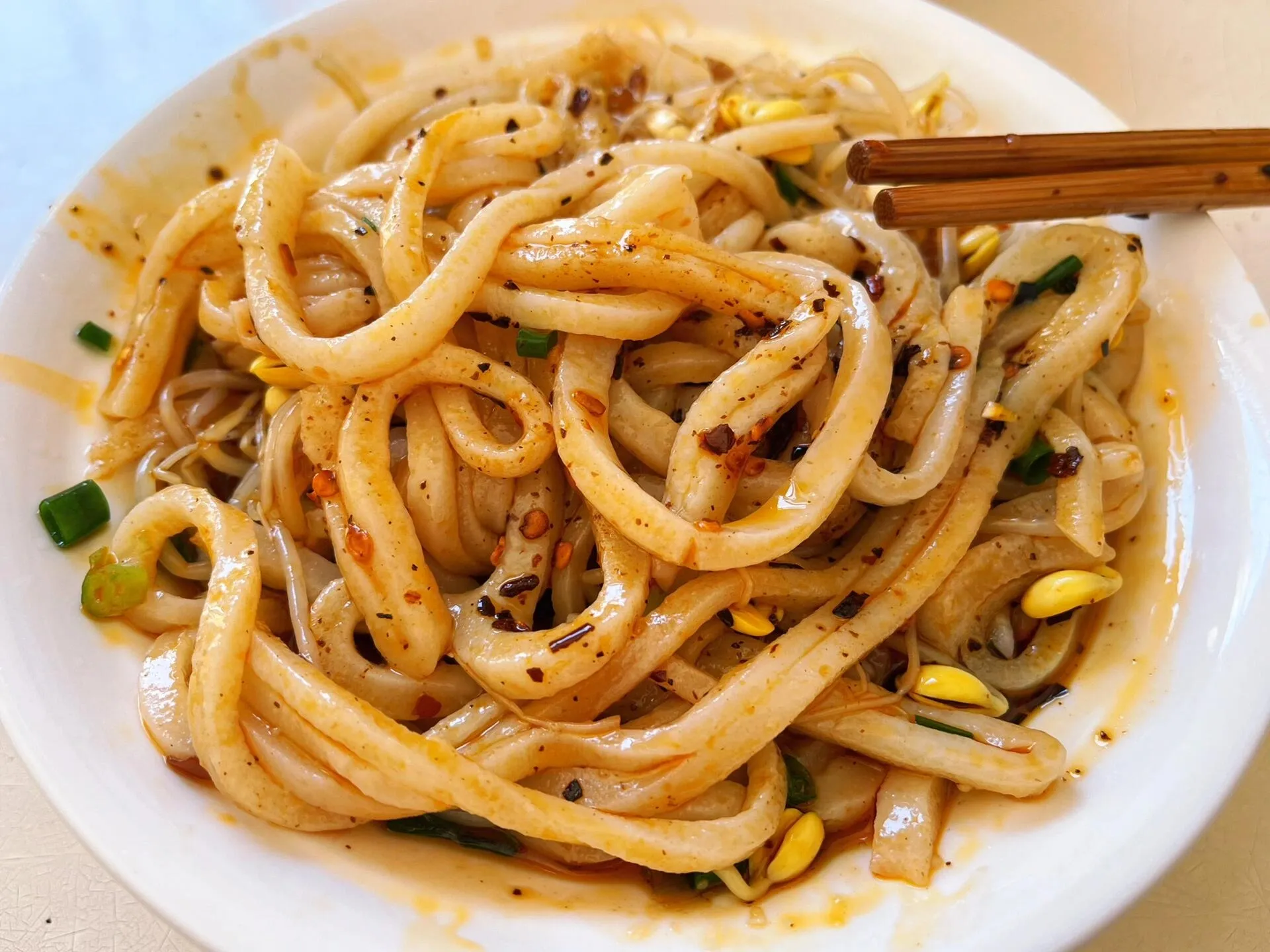 随便找一家都差不多,糖醋味很特别,口感介于凉皮和面条之间,挺好吃的。
