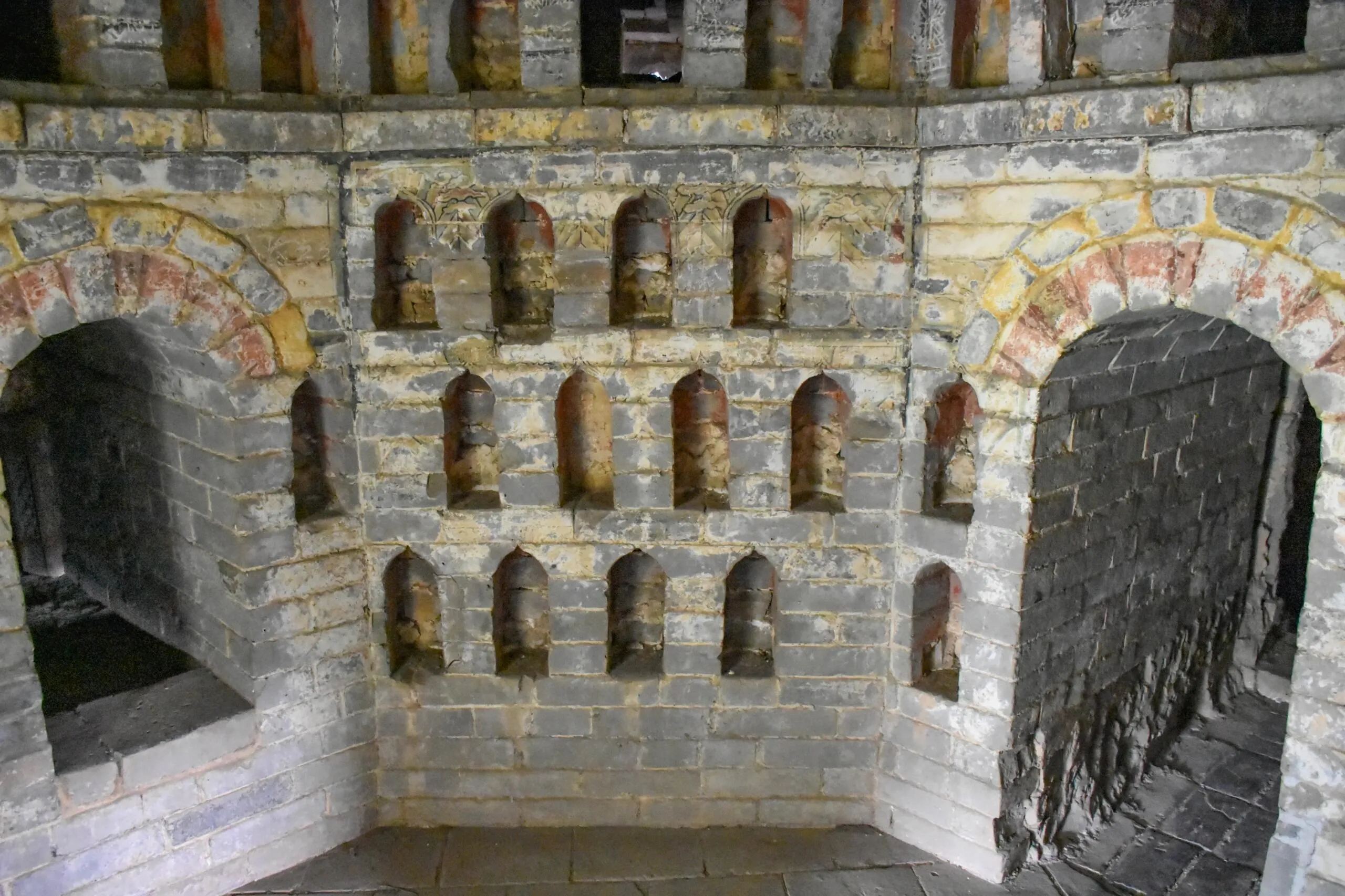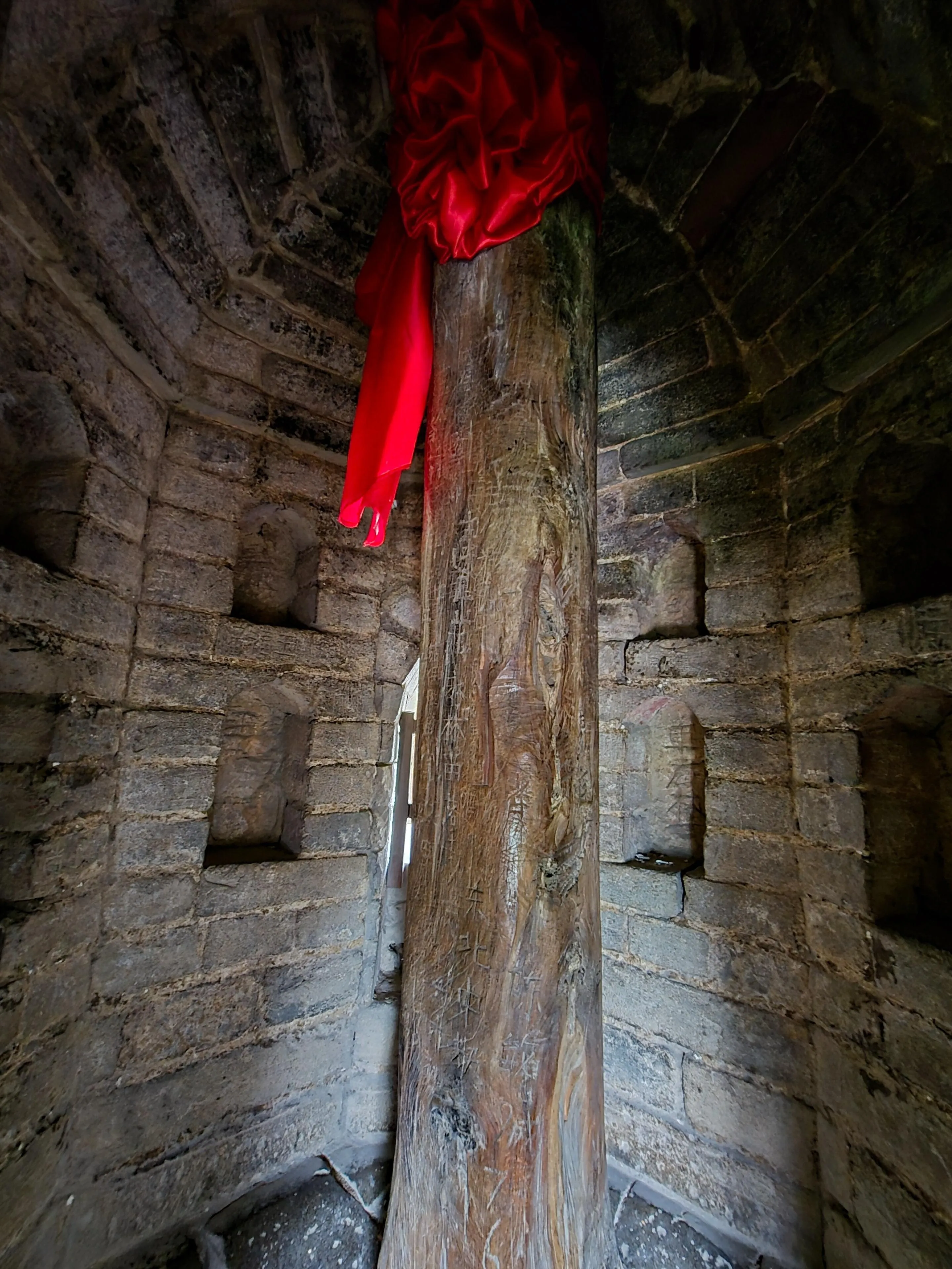 登塔体验非常独特。塔身内部的台阶通道极窄,只能一个人通行。如果遇到登塔人员较多的情况,可能需要上下喊话沟通。临近塔顶两层时,甚至需要侧身才能通过。到达塔顶后,可以看到一根塔心柱。塔内有几层存有佛龛,虽然没有佛像,但佛龛内保存有彩绘。