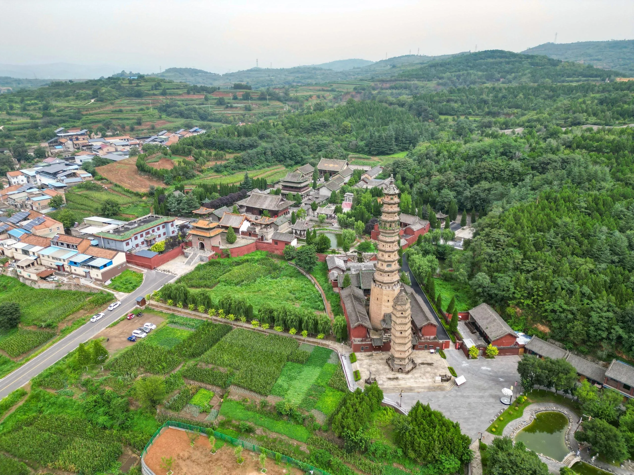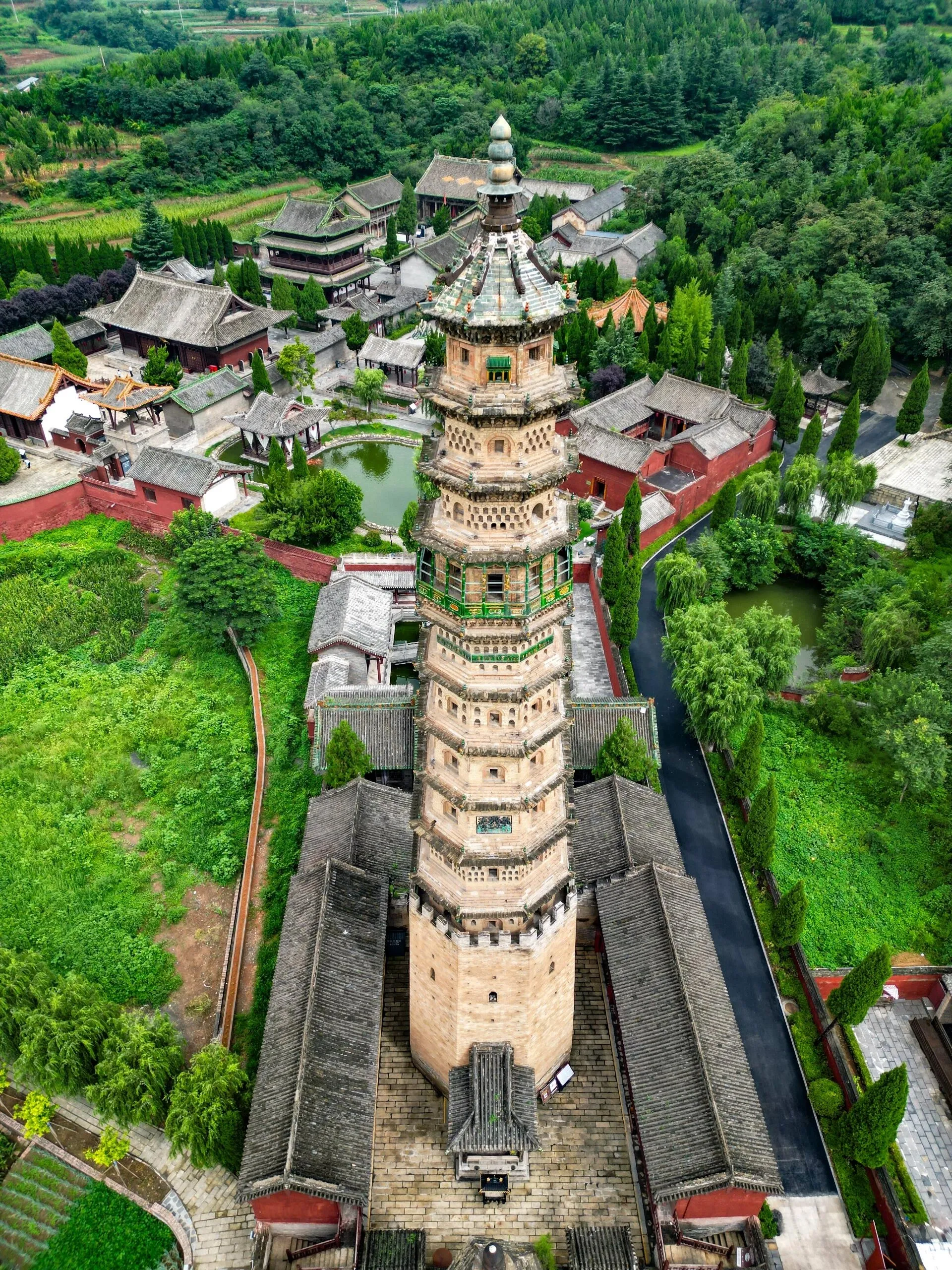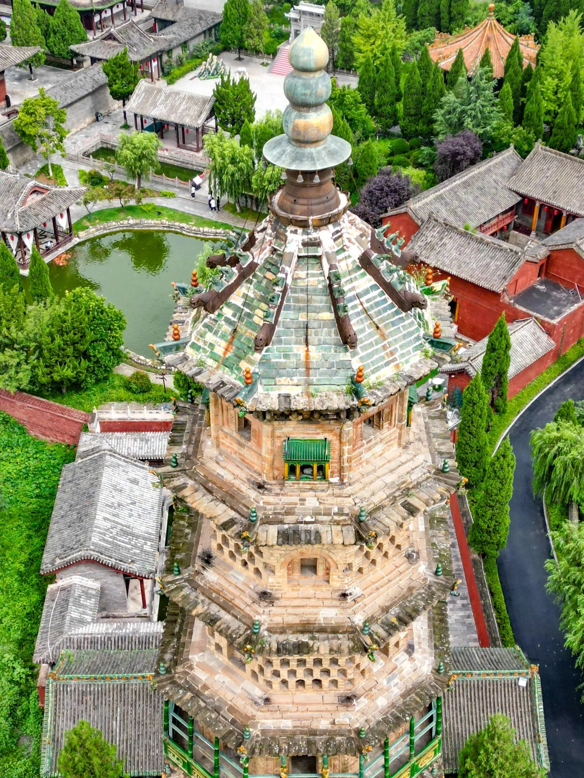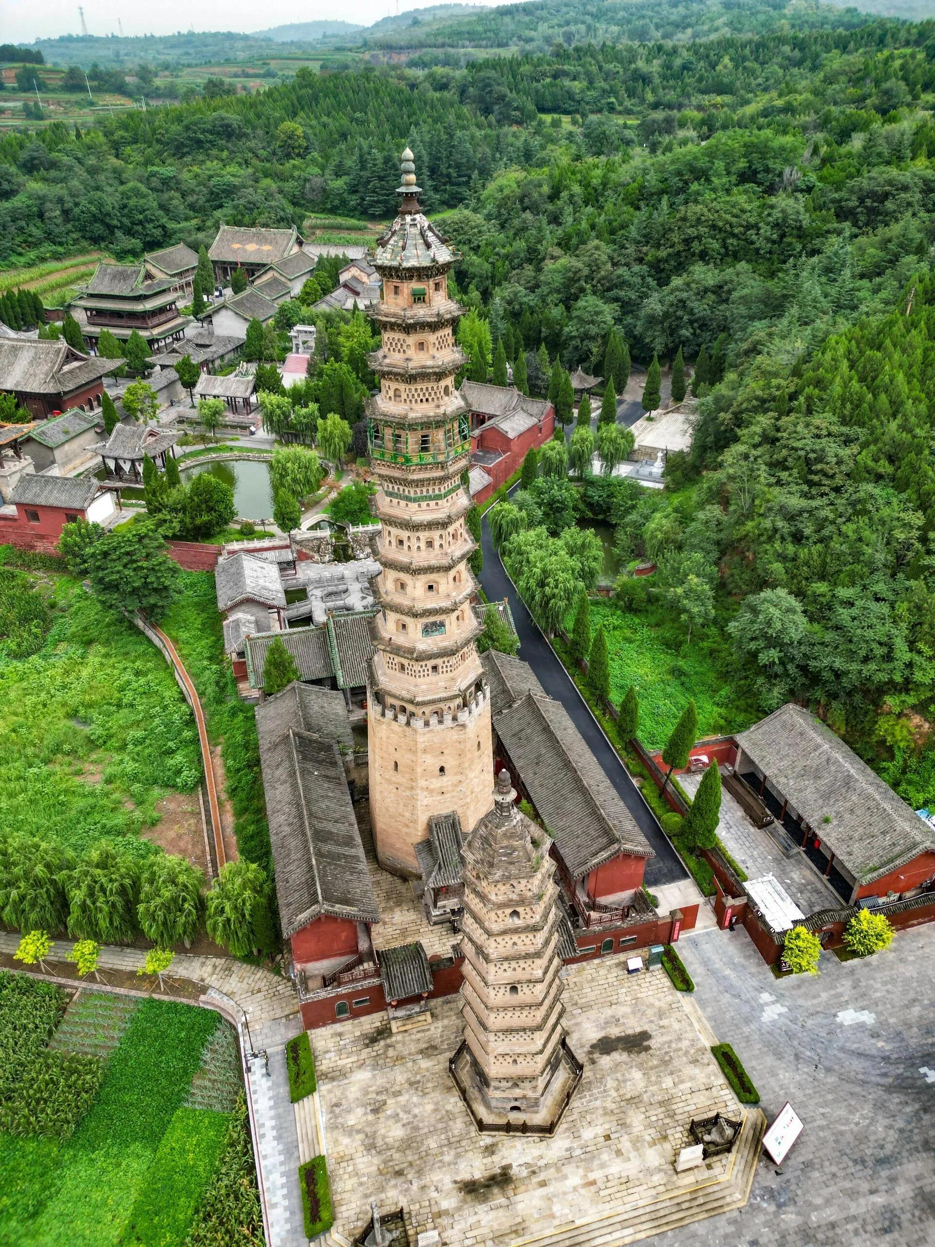 旁边的高塔则建于明嘉靖四十年(1561年)。这座塔可以登上去参观,是一座八角十三级楼阁式砖塔,高约57米。塔身外壁部分镶嵌着琉璃砖雕,下三层被类似城堡式的砖墙包围,展现了晋东南的建筑风格。据传言,这座大塔的建立是为了替小塔挡风。因为这里风力强大,为了保护小塔不继续倾斜,当地富商捐资建立了这座琉璃塔。