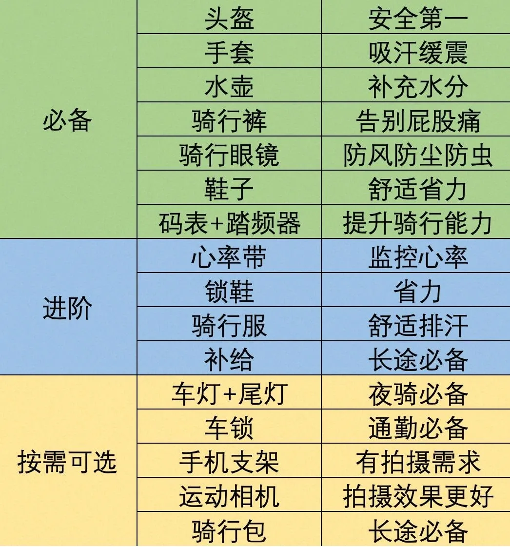 新手阶段要遵循多骑少买的原则,在实践中发现问题再针对性购买装备。骑行既是有限游戏也是无限游戏,既要追求速度,也要让它成为生活的一部分,持续进步,享受乐趣。认真生活,快乐骑行,健康第一。