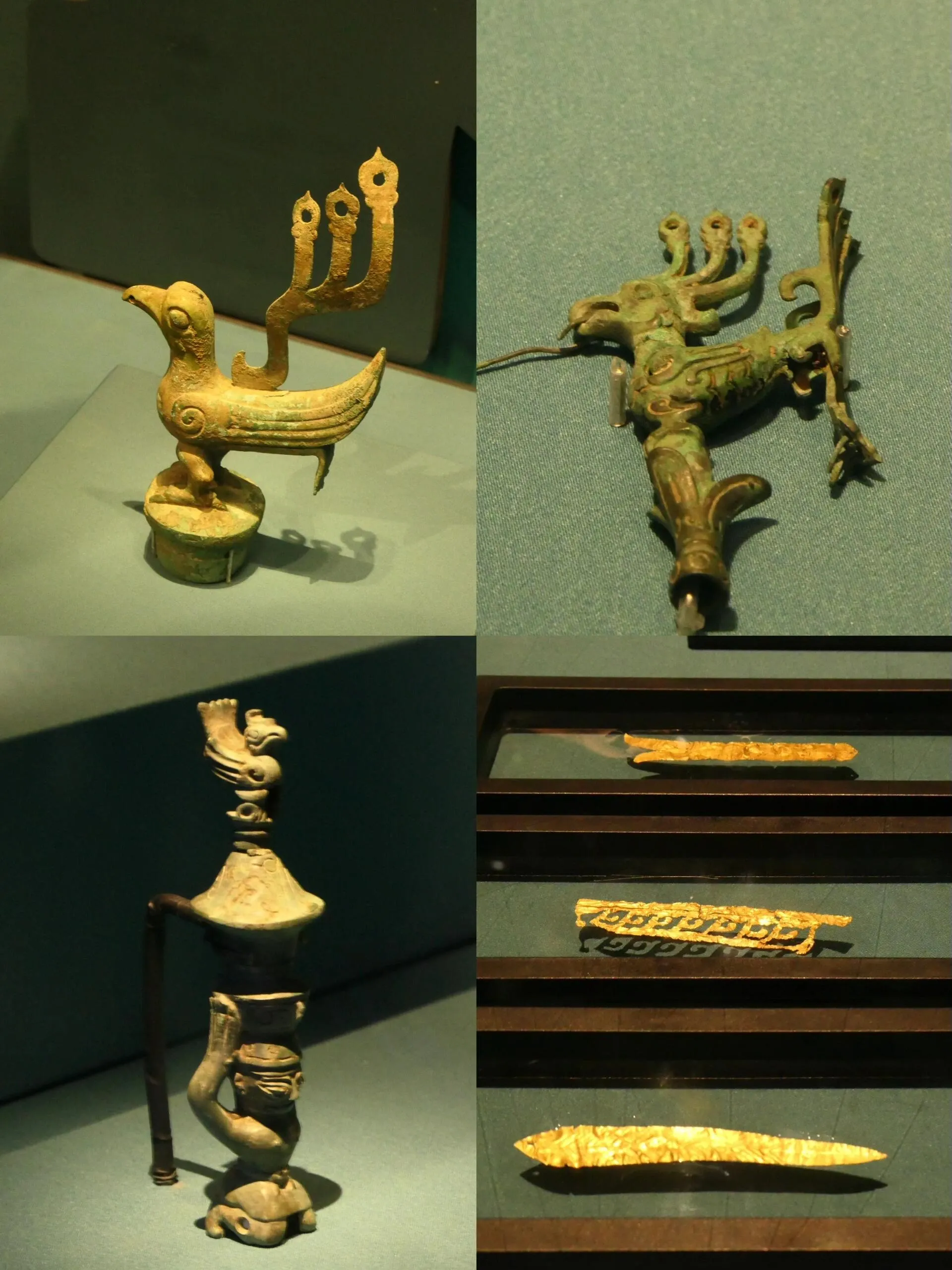 展览中展出了多件三星堆文明的代表性文物,包括金面具、大面具、纵目面具、金面罩人头像和青铜立人等。这些文物展现了三星堆文明独特的艺术风格和高超的青铜冶炼技术,引发了人们对这个神秘文明的诸多猜想。