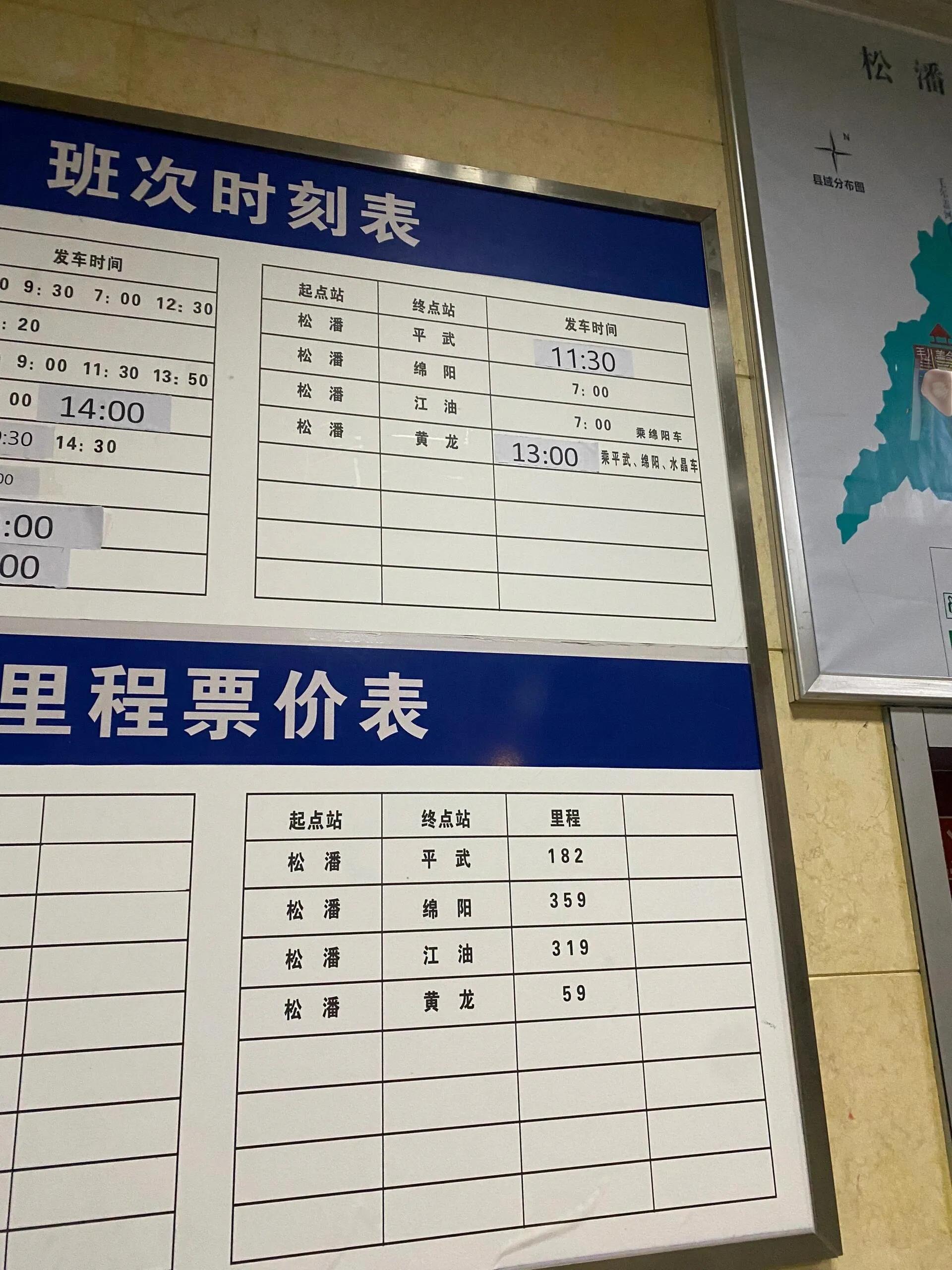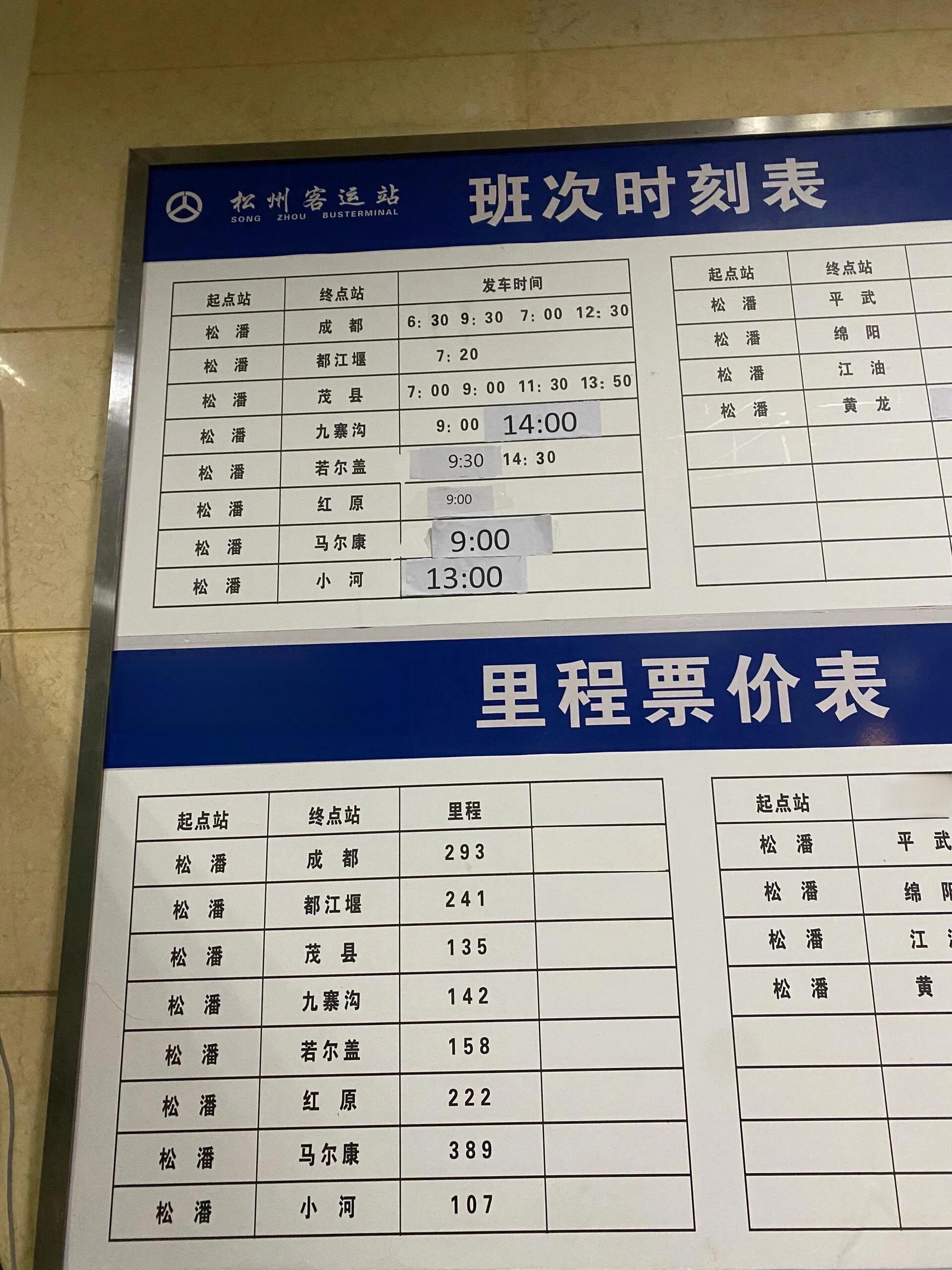 到了车站后,我发现从松潘出发,除了去九寨沟,还可以坐巴士前往黄龙和若尔盖(松潘是必经之路)。如果不是自驾游,选择巴士可能比包车更经济实惠。