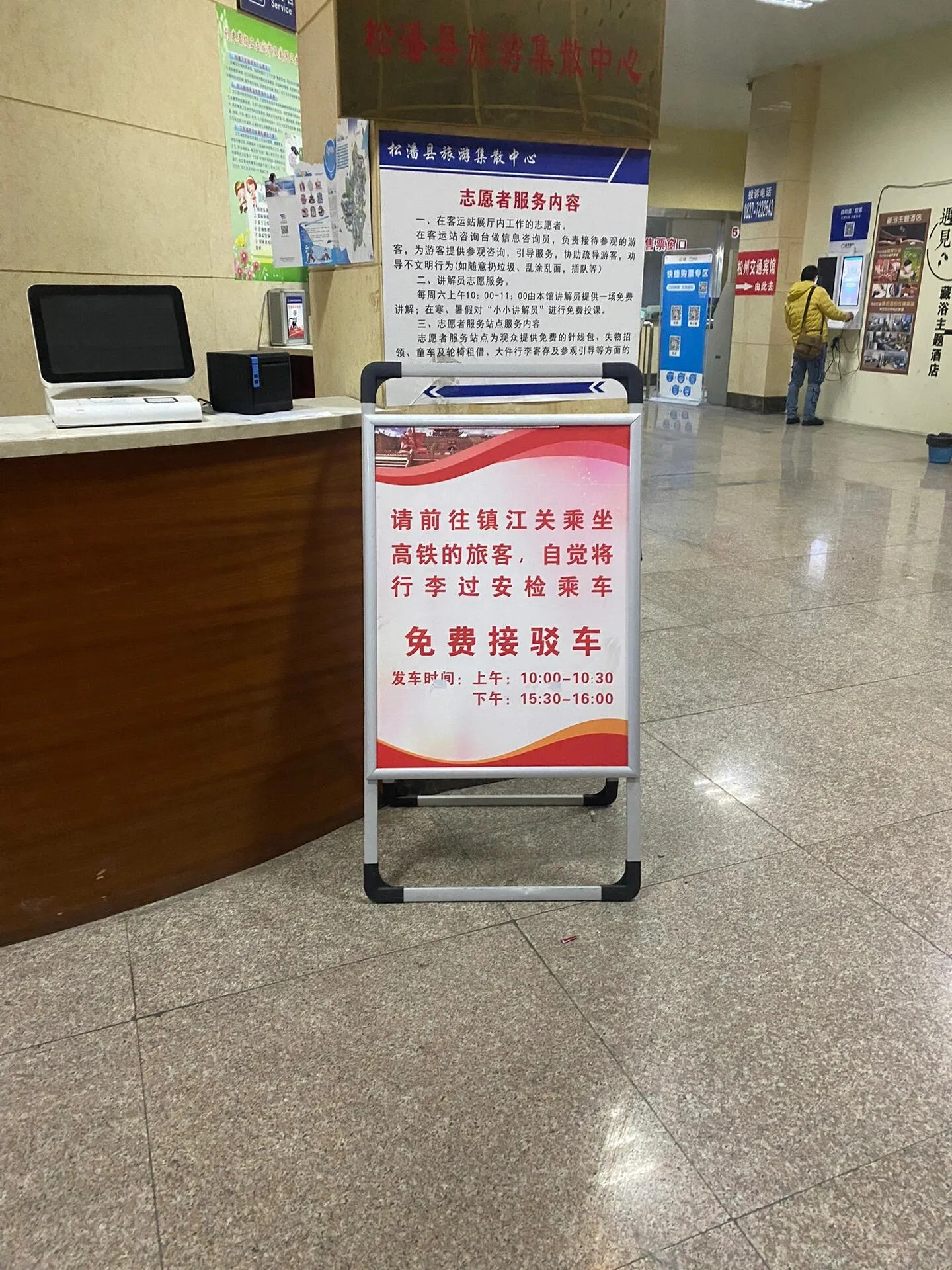 师傅建议我们乘坐7点到7:30的免费松潘接驳巴士。后来了解到,这些巴士都是九寨沟景区提供的,负责把游客送到景区,同时也接送高铁站的旅客。我猜测只要高铁有班次,就应该有对应的巴士接送服务。