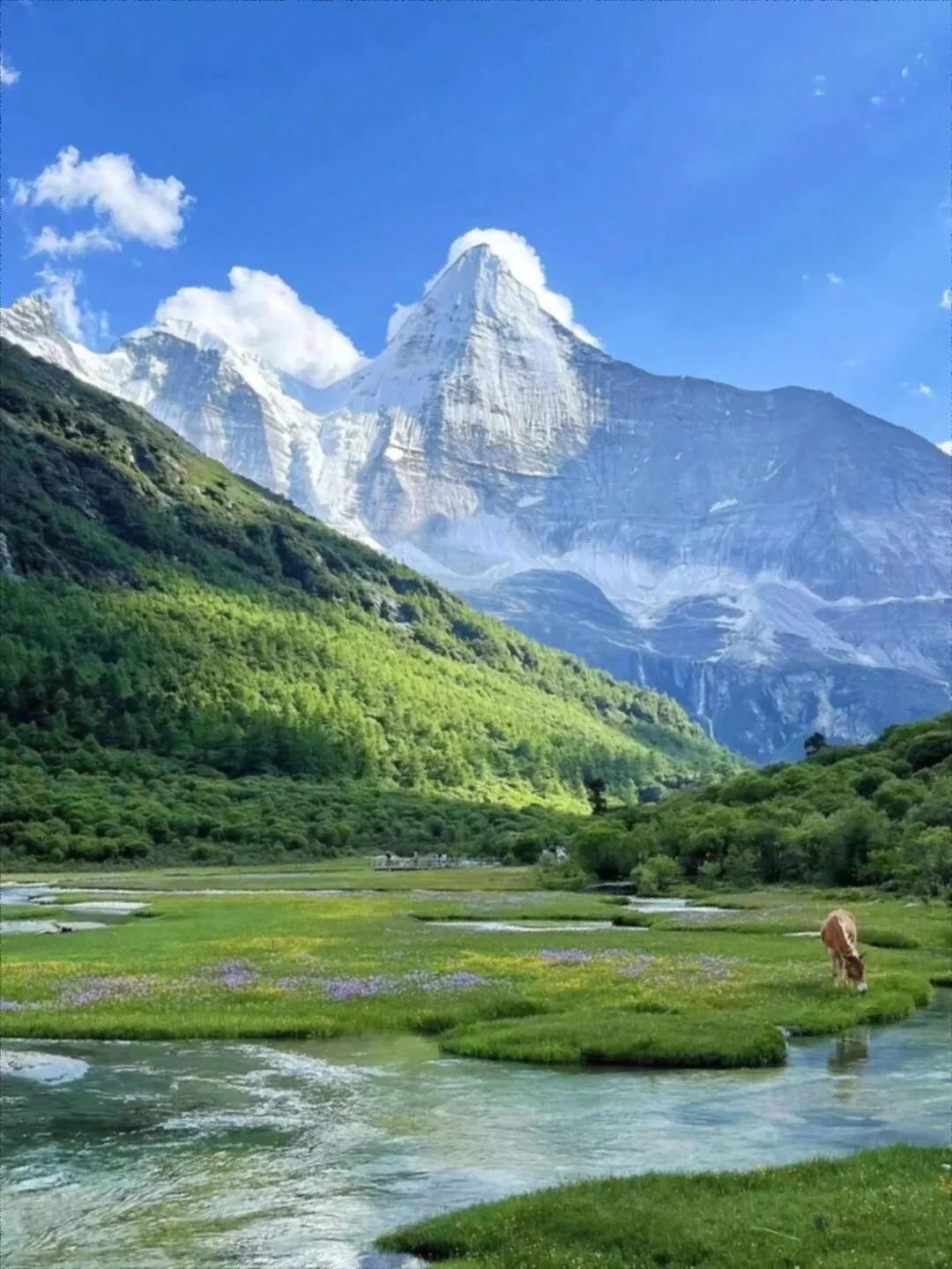 洛绒牛场的栈道溪流是必打卡的景点,还能欣赏到雪山美景。