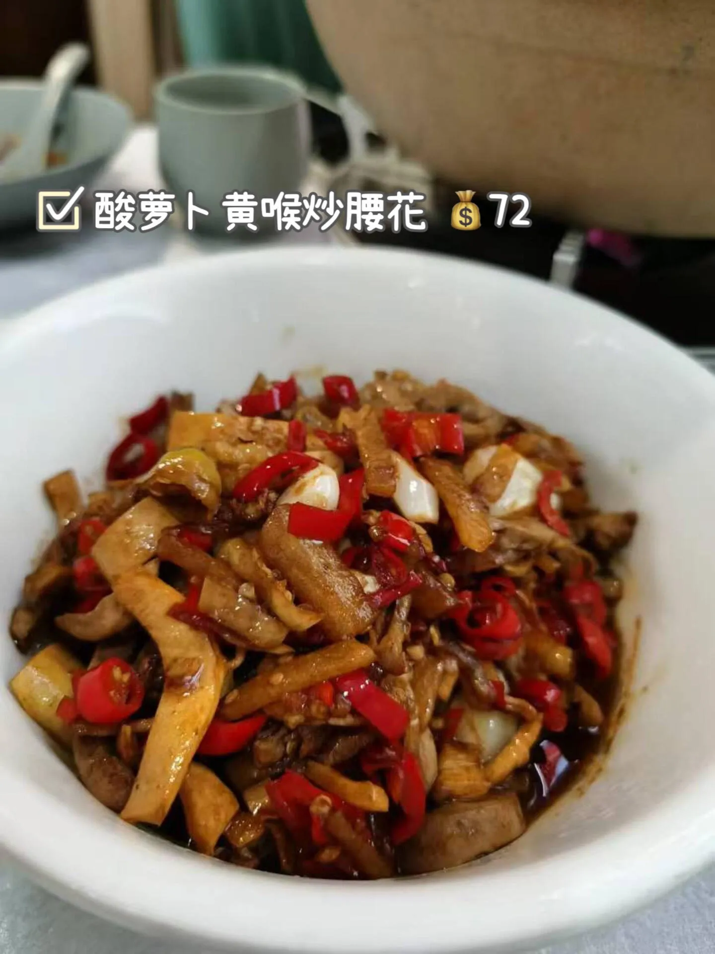 酸萝卜黄喉炒腰花是唯一令人失望的菜品。食材切得过于细碎,与辣椒难以分辨。虽然这是湖南的一种烹饪方式,但这道菜的呈现效果欠佳,给人一种剩菜的感觉。