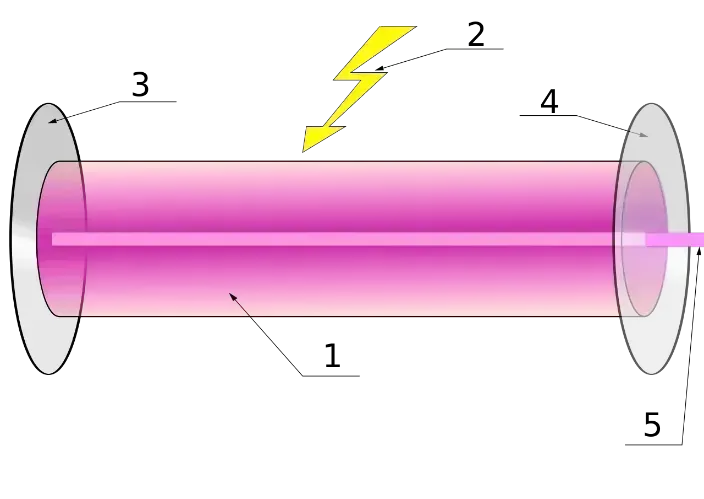 在红宝石棒两端,梅曼安装了两面镜子,其中一面鏡上挖了一个小孔,使得在增益介质中来回穿梭的受激辐射光能够“诱惑”更多光子,待光强达到一定程度后,激光便从小孔中发射出去。
