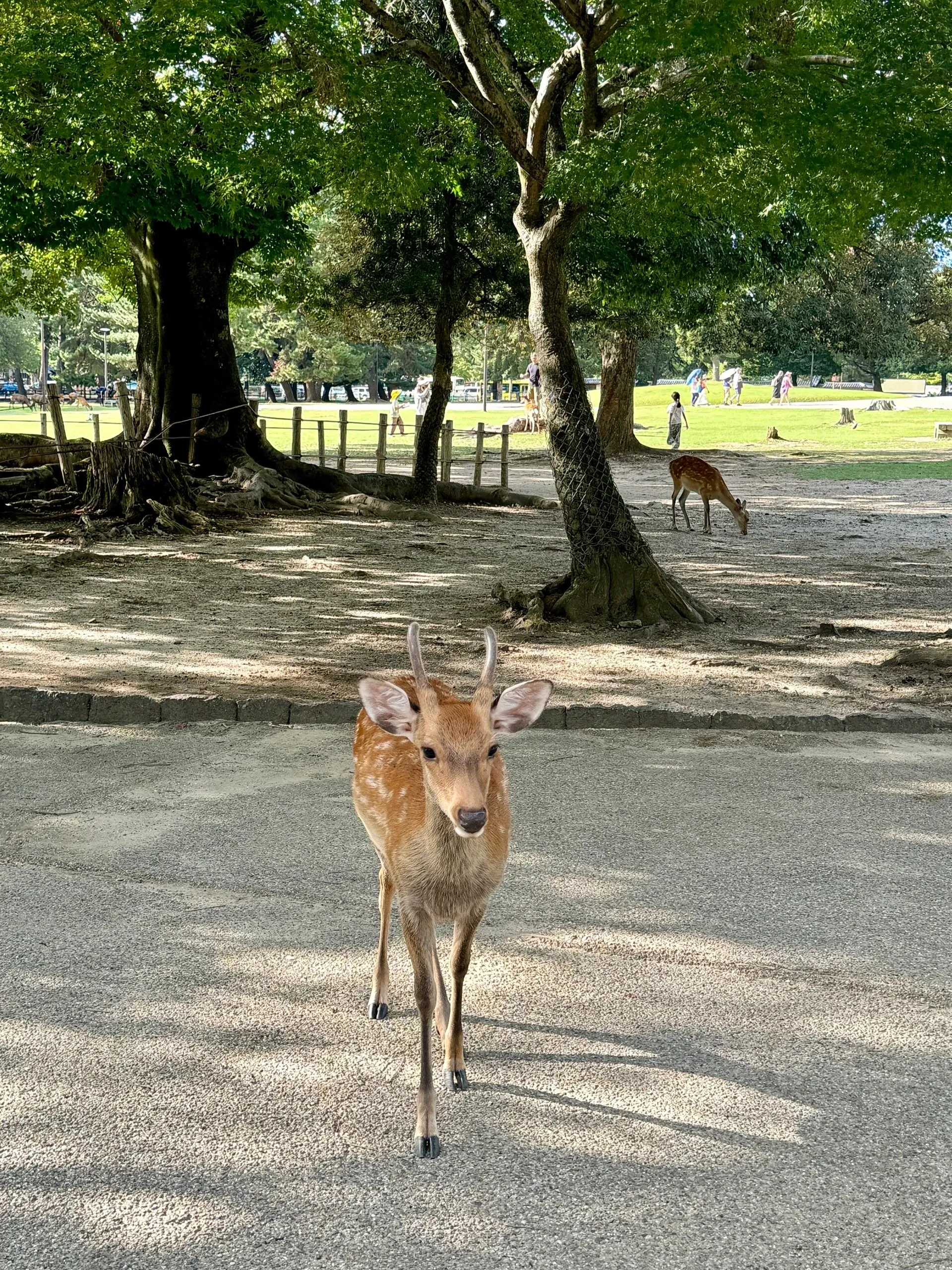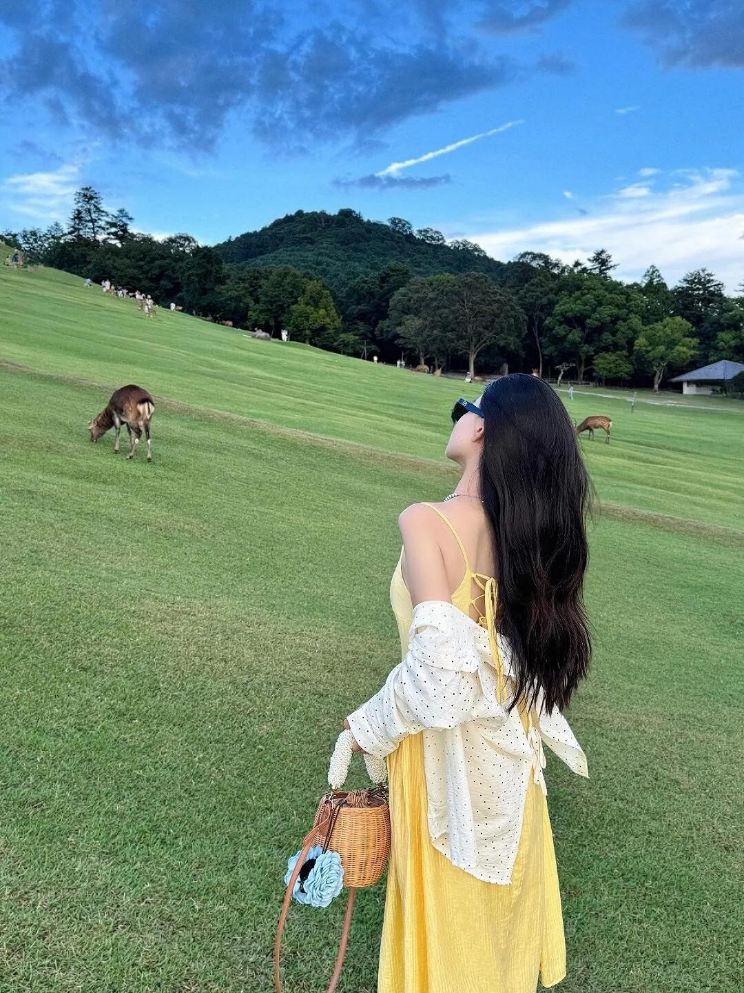 下午从宇治站乘坐JR线到奈良站(510日元)。出站后按指示牌到达奈良公园站。在公园里可以看到许多小鹿。步行约20分钟,朝春日大社方向前往若草山。若草山门票150日元,是欣赏蓝天和草地美景的绝佳地点。