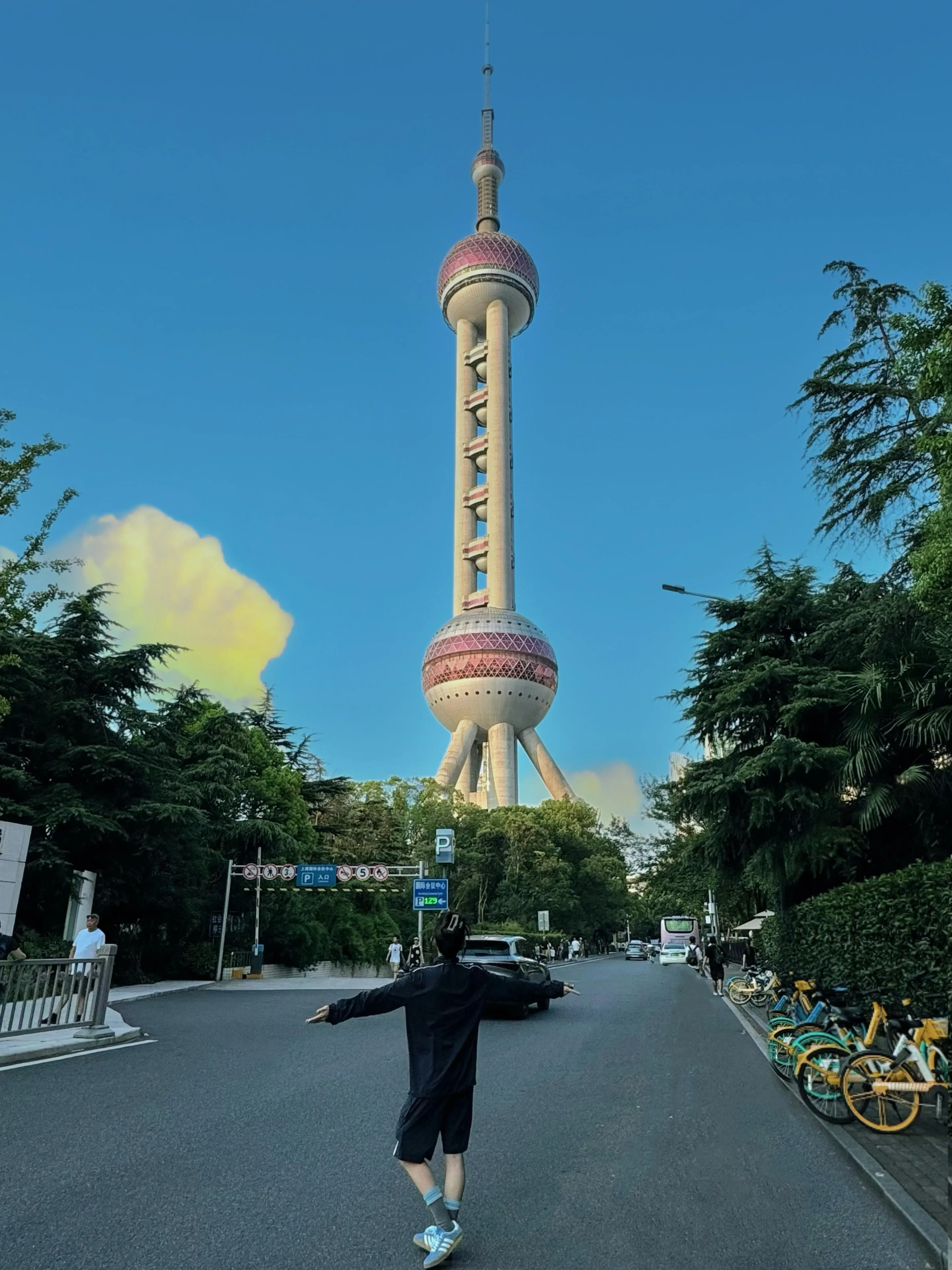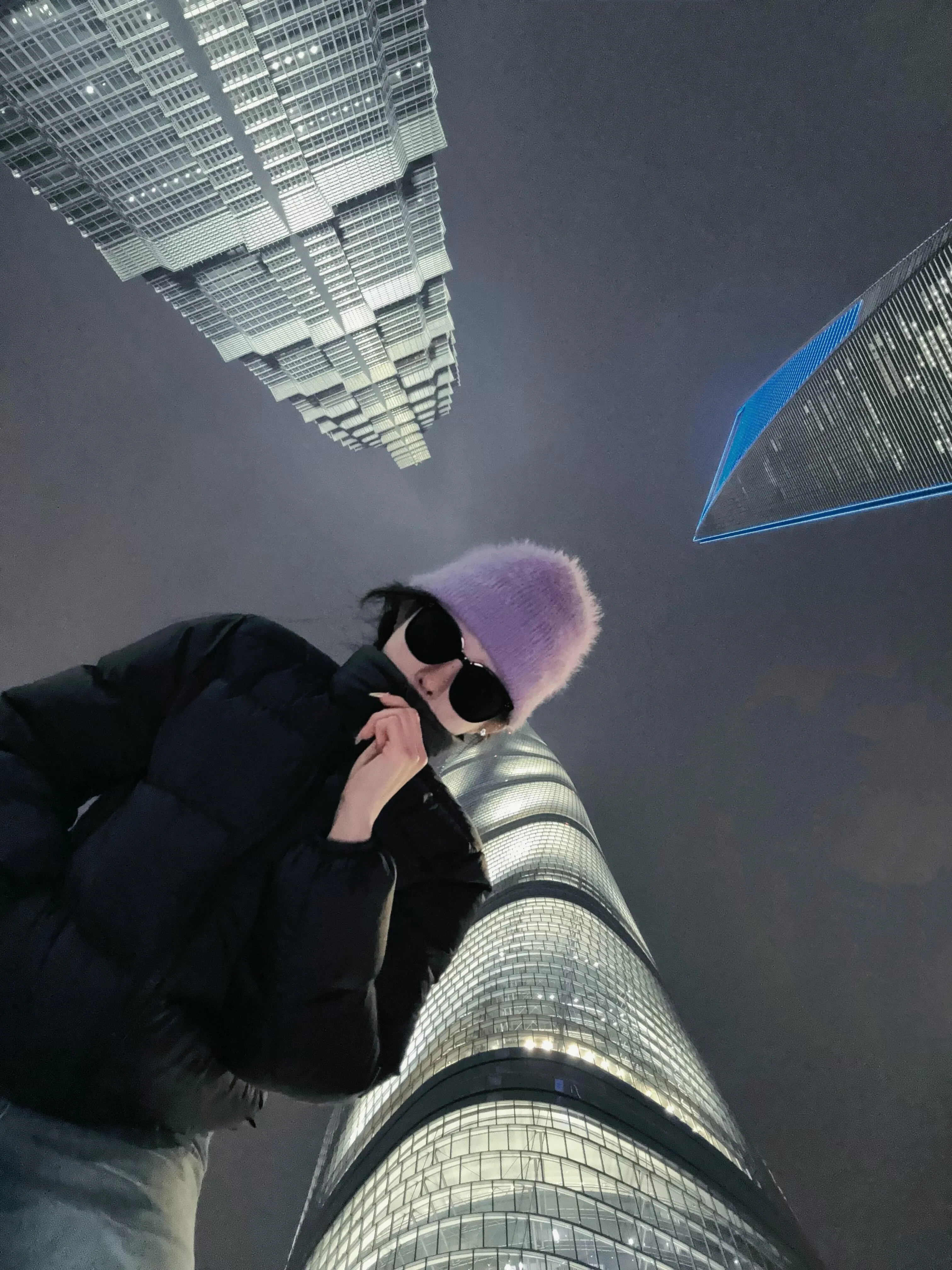 陆家嘴:导航金茂君悦大酒店,或乘地铁至陆家嘴站8号口出。这里有两个拍摄点:一个是途中会经过的环形区域,人不多;另一个是下了天桥后看到的明珠塔视角。三剑客的经典机位是站在花坛边缘,手机打开广角,放地上,摆好动作开闪光。