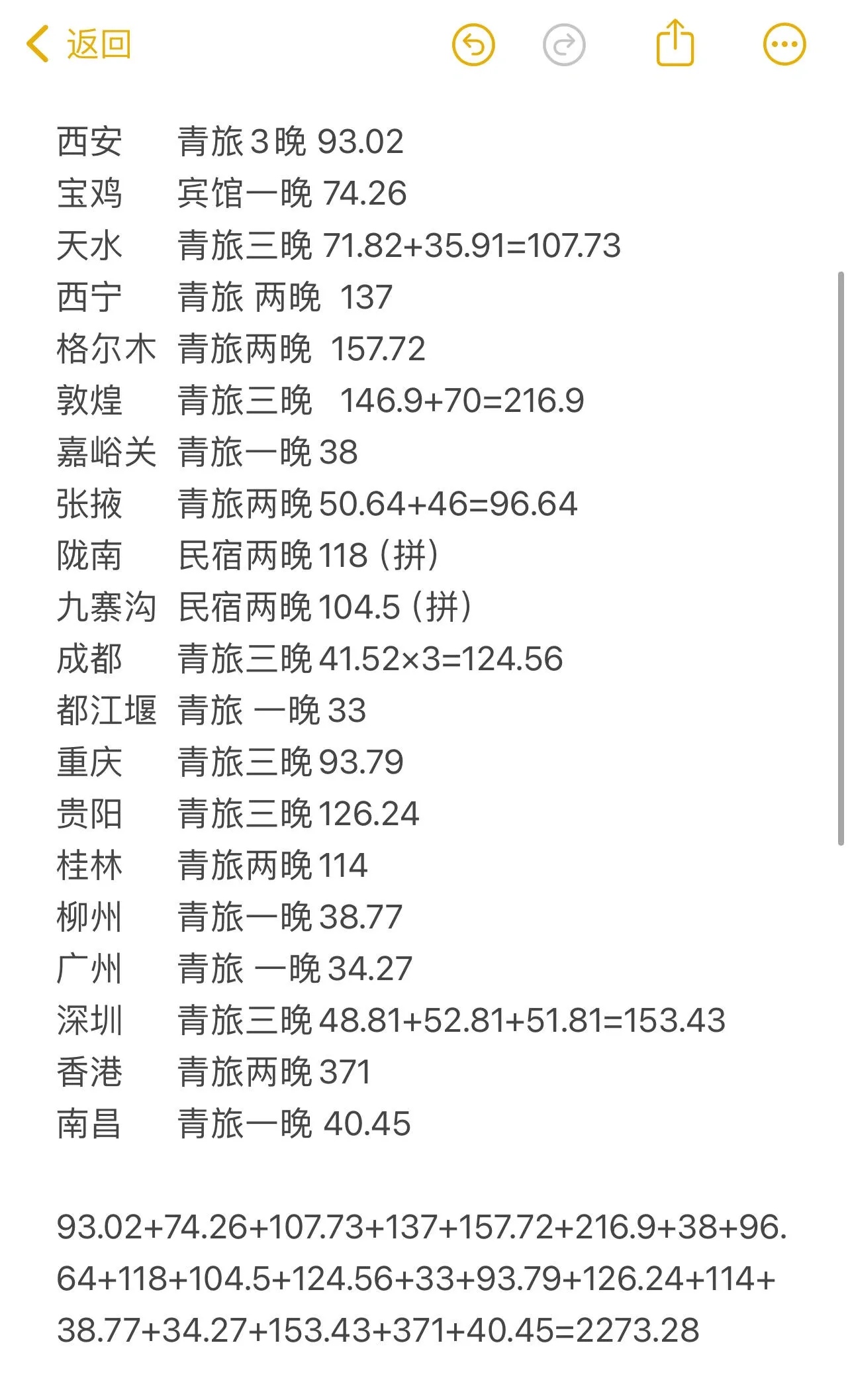 住宿方面,总花费2273.28元,主要选择青旅。其中陇南和九寨沟与旅伴合住民宿,平均每晚50元。最贵的是香港青旅,371元一晚的太空舱。