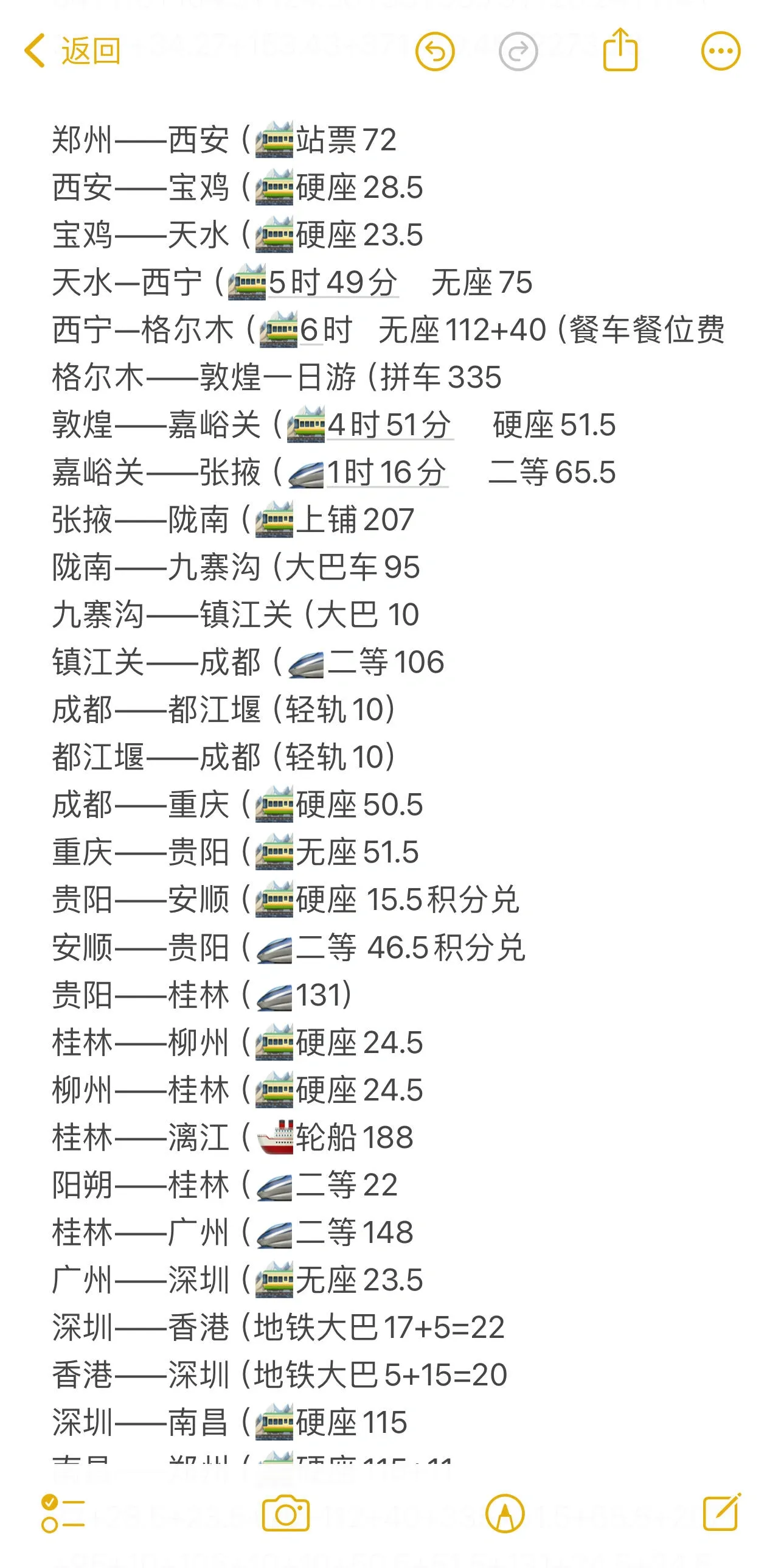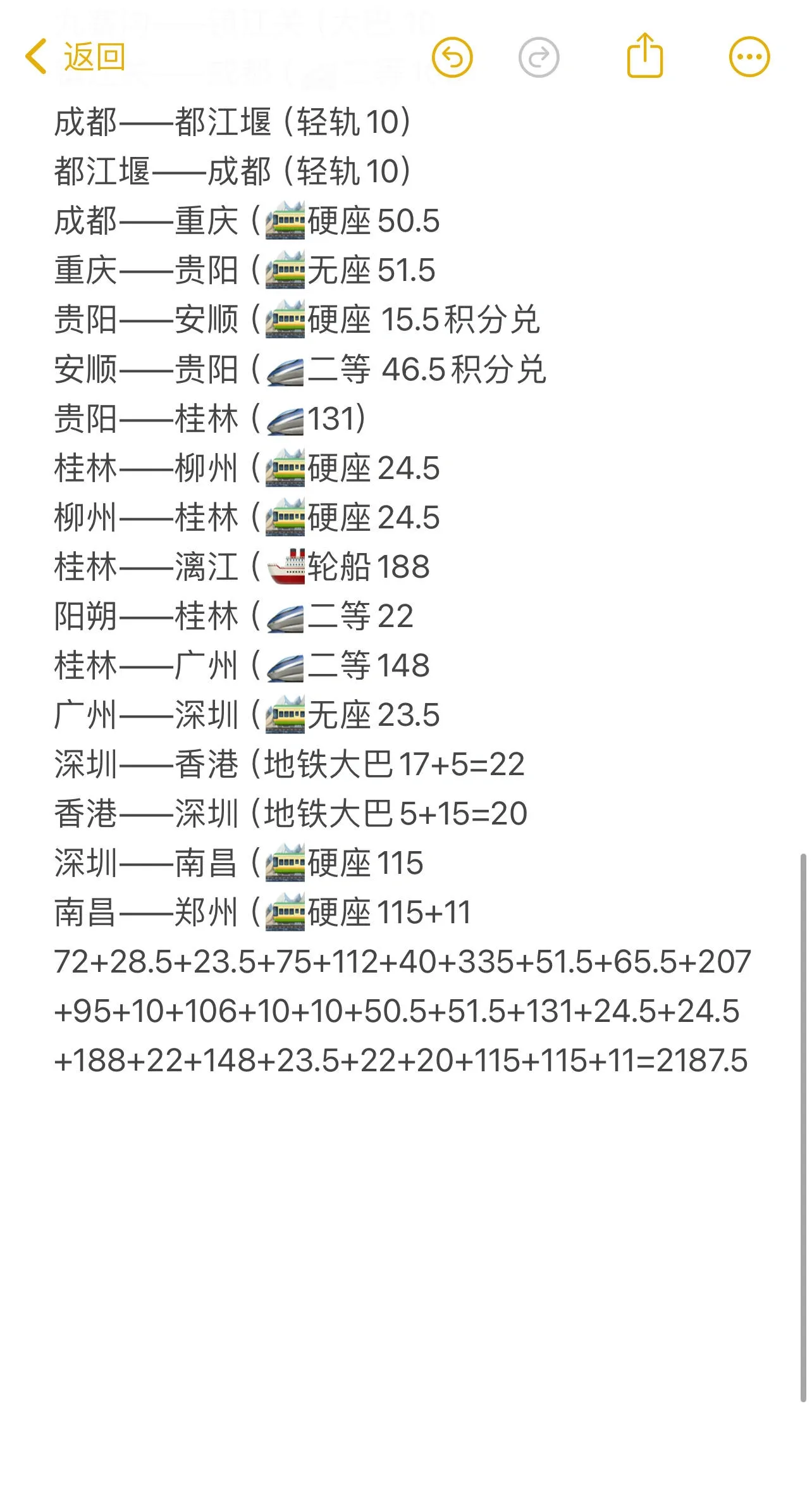 交通费用为2187.5元,以火车为主,部分地方选择高铁。使用积分兑换省下约60元,但改签费和退票费共计约100元。