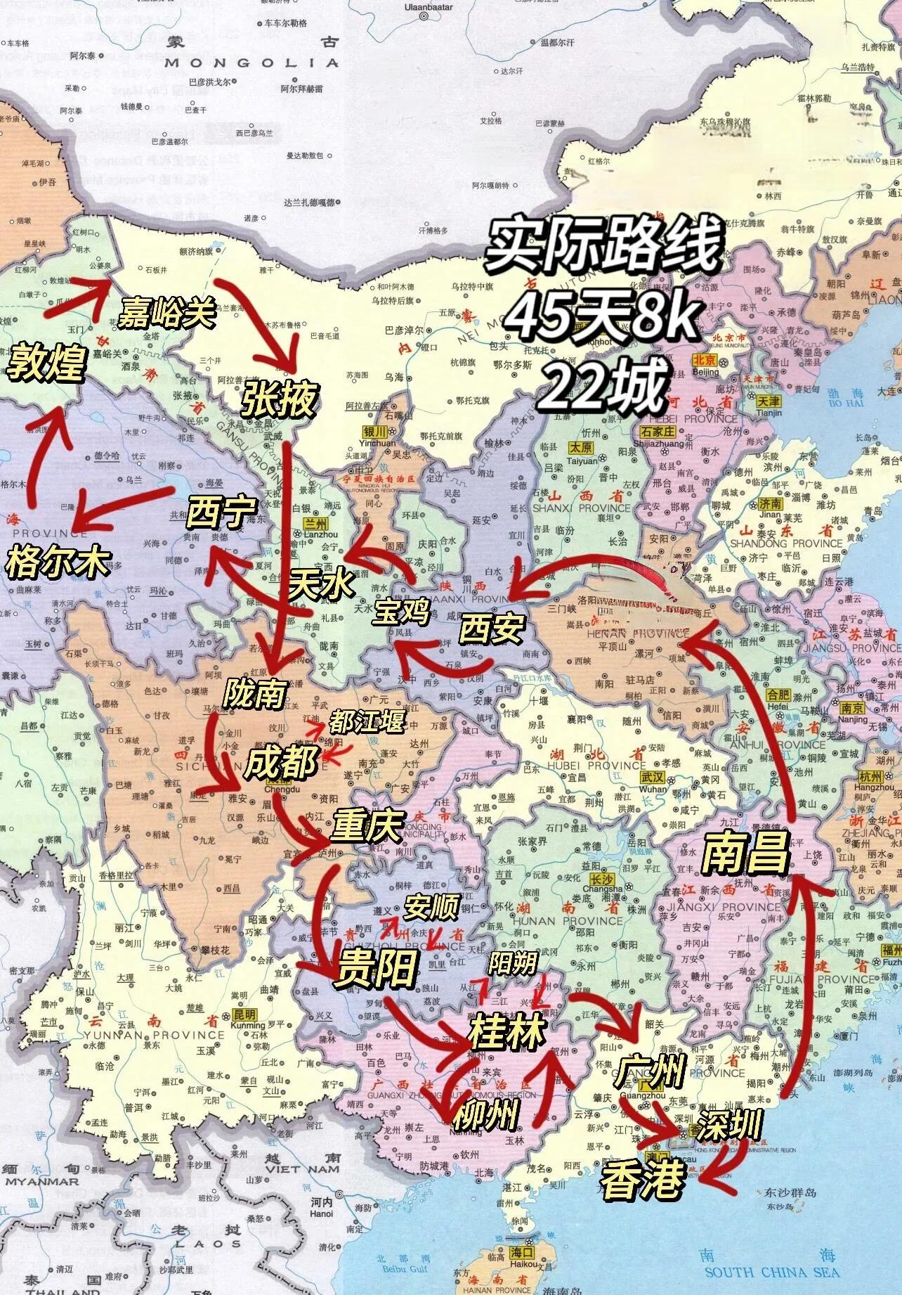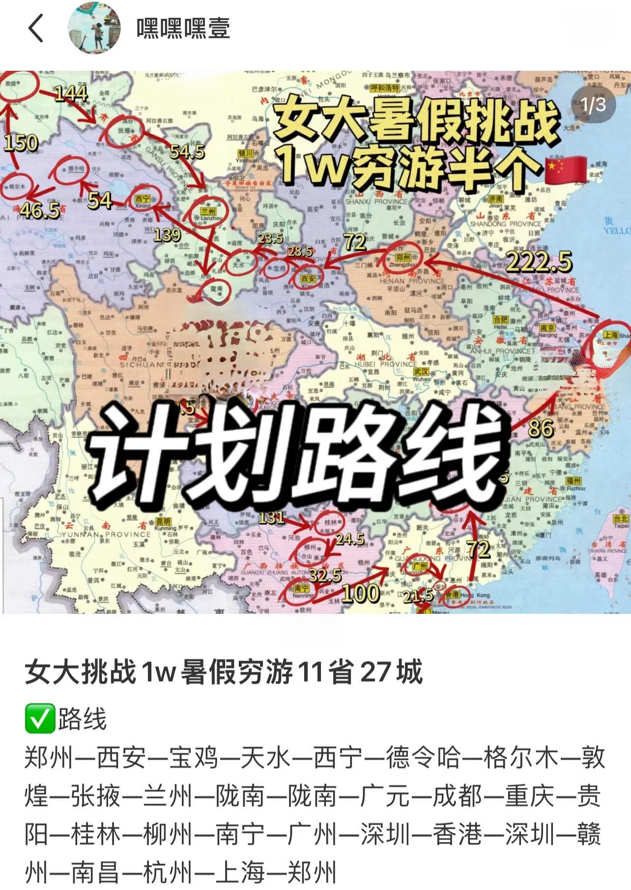 一位女生独自完成了45天22个城市的环游计划,总花费约8000元。这次旅行从7月12日郑州出发,8月26日从南昌返回。