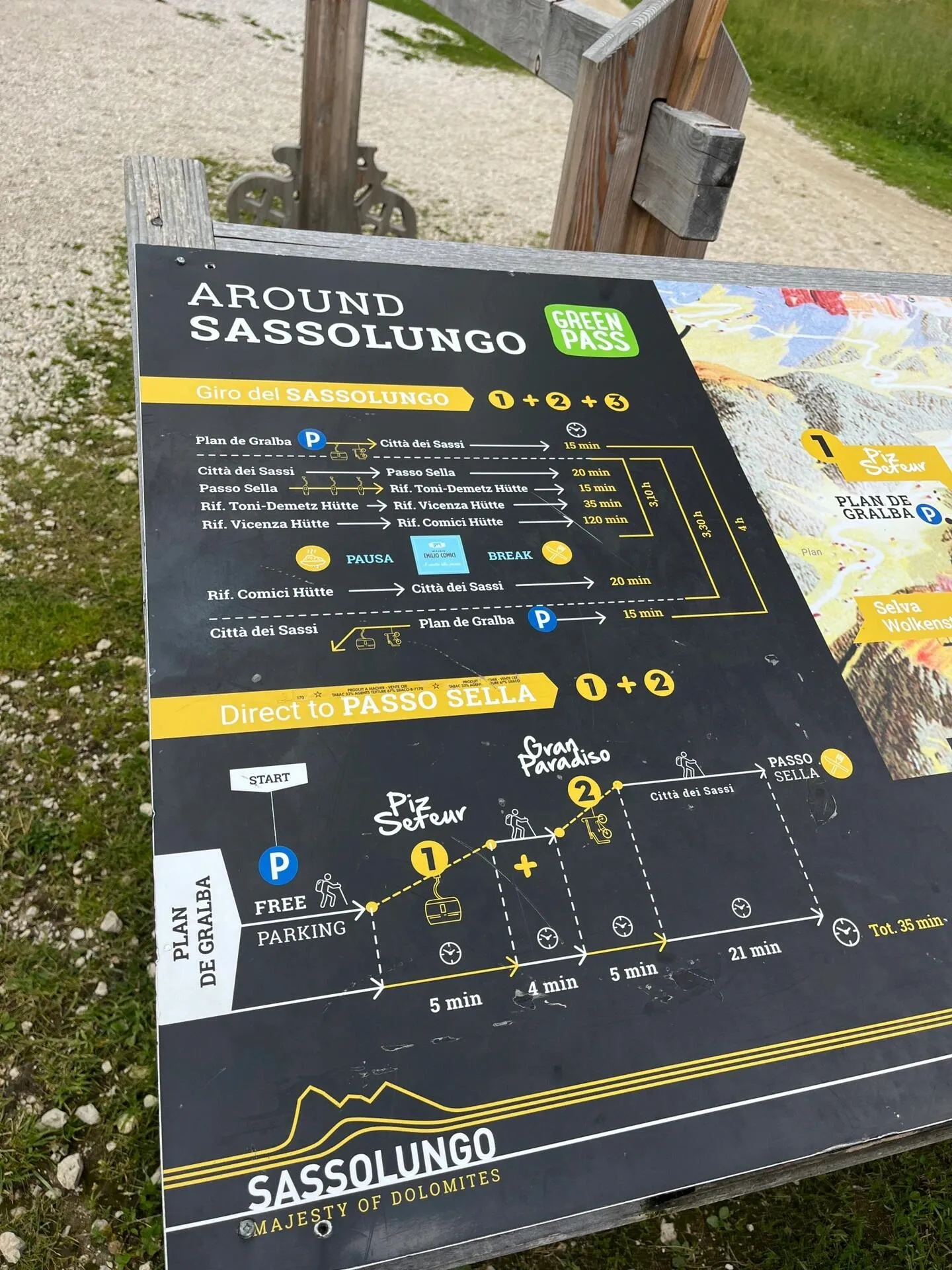 乘坐352路公交车到Plan de Gralba(约30分钟),下车即是缆车站。乘坐16号缆车(Piz seteur)上山,然后步行5分钟连接到17号缆车。17号缆车(GranParadiso)风景非常美,可以近距离欣赏Sassolungo群山。下站后步行20分钟(下坡)到18号缆车站。18号缆车是一种老式双人缆车,直达山顶垭口。这里有一个山屋,可以品尝美味的牛肉汤。